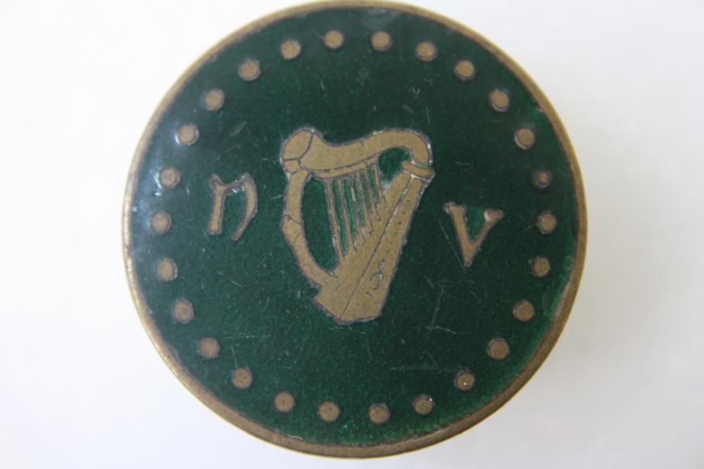 National Volunteer badge c.1915, for buttonhole. Bronze faced in green enamel. Circular face on which is a harp dividing N.V. On stand 'Made in Ireland, Quinn, Belfast'.;