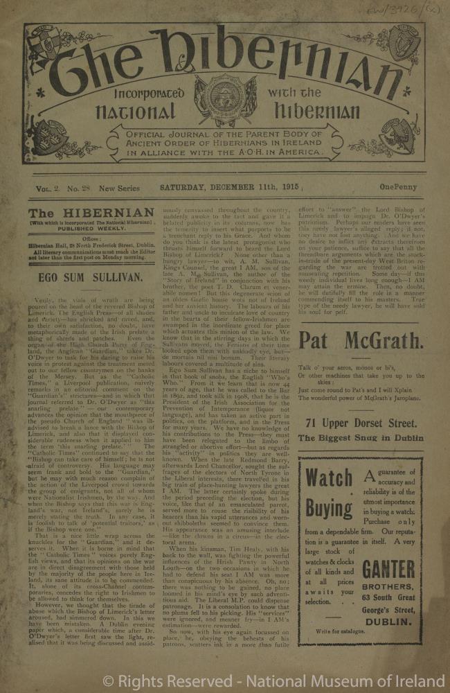 File of the Hibernian 1915/16 comprising issues of 26 June, 3, 17, 31 July; 7, 21, 28 August; 9, 16 Oct.; 27 Nov.; 11 Dec. 1915; 8, 15 Jan.; 5 Feb. 1916.;