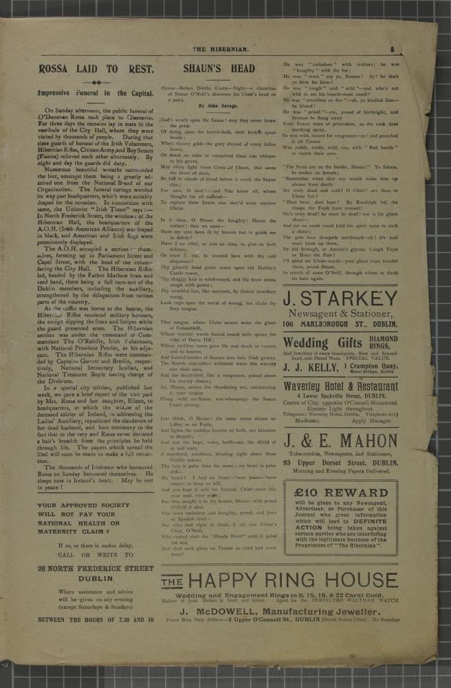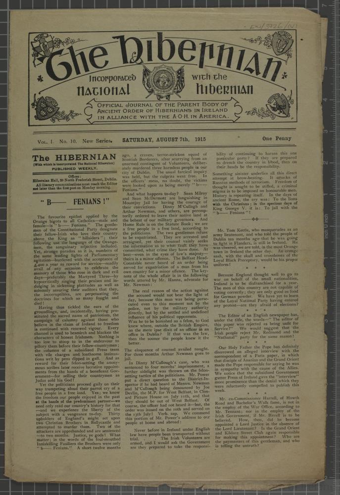 File of the Hibernian 1915/16 comprising issues of 26 June, 3, 17, 31 July; 7, 21, 28 August; 9, 16 Oct.; 27 Nov.; 11 Dec. 1915; 8, 15 Jan.; 5 Feb. 1916.;