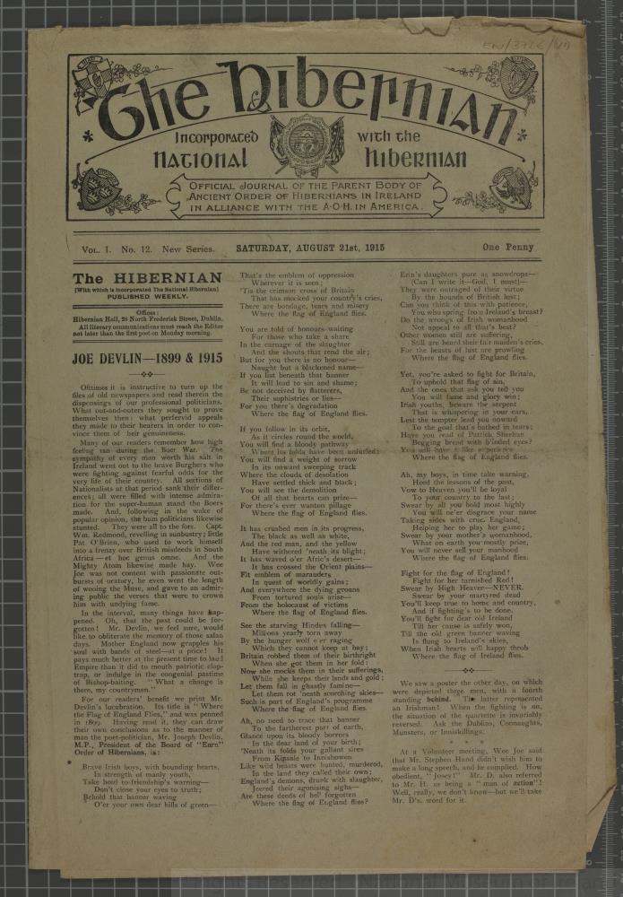 File of the Hibernian 1915/16 comprising issues of 26 June, 3, 17, 31 July; 7, 21, 28 August; 9, 16 Oct.; 27 Nov.; 11 Dec. 1915; 8, 15 Jan.; 5 Feb. 1916.;