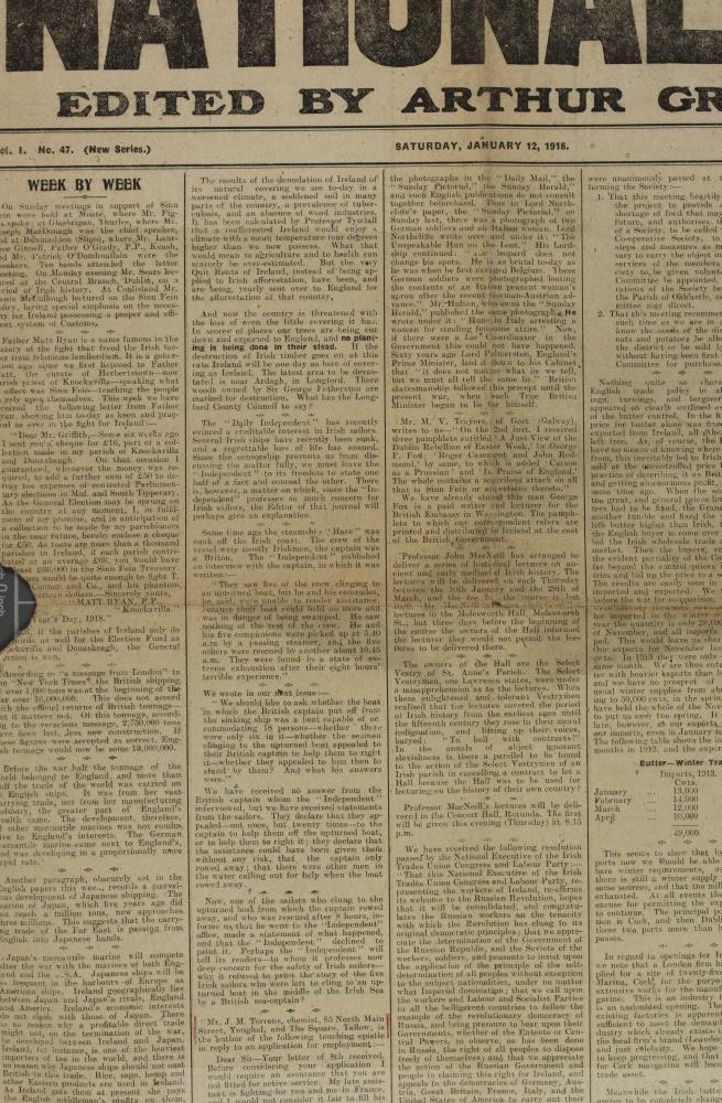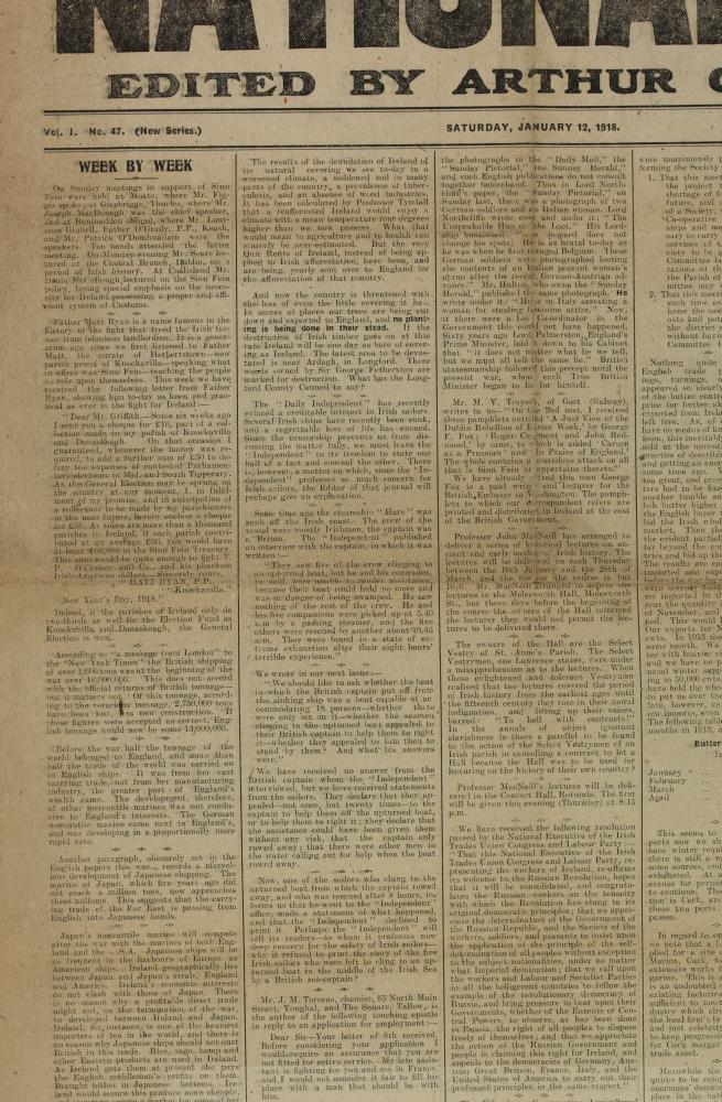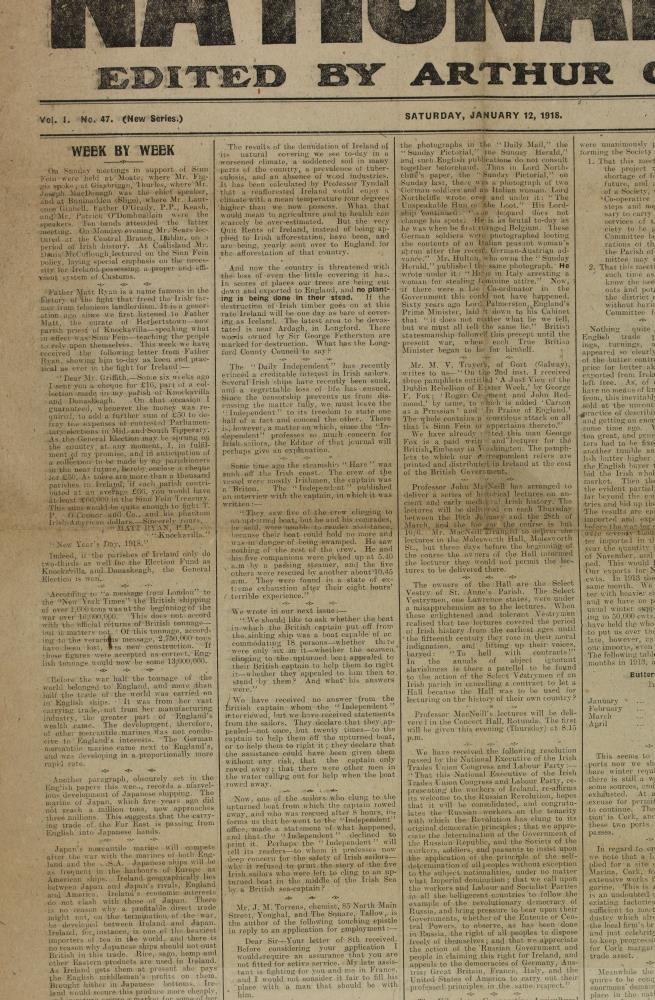 Newspaper page, Dublin,1918. 'Nationality', edited by Arthur Griffith. Vol. 1, No. 47 (New Series), Saturday, January 12, 1918. 4pp.;