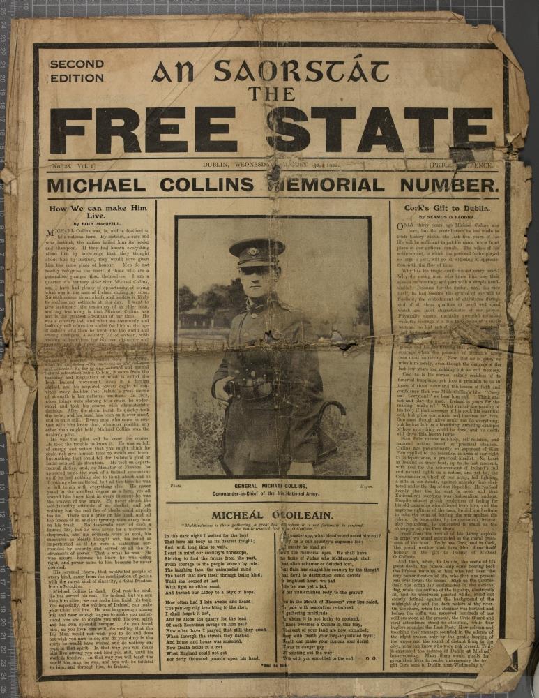 Newspaper, Dublin, 1922. 'An Saorstat: The Free State'. No. 28, Vol, 1 (second edition), Dublin, Wednesday, August 30, 1922. "Michael Collins Memorial Number". Lead articles: 'How We Can Make Him Live', by Eoin MacNeill, and 'Cork's Gift to Dublin' by Seamus O hAodha. 8pp. In very poor condition -- torn, and disintegrating at edges. Length 51 cm x Width 39.2 cm.;