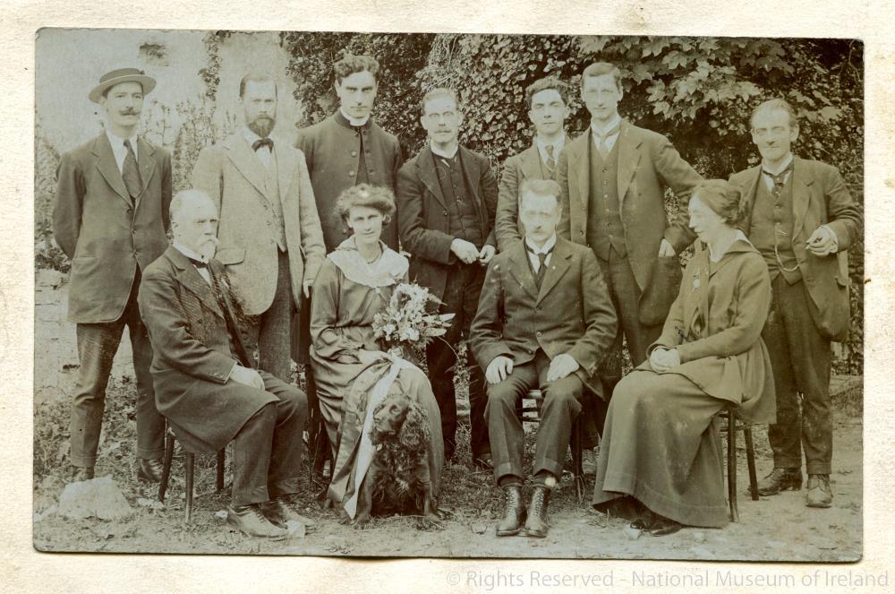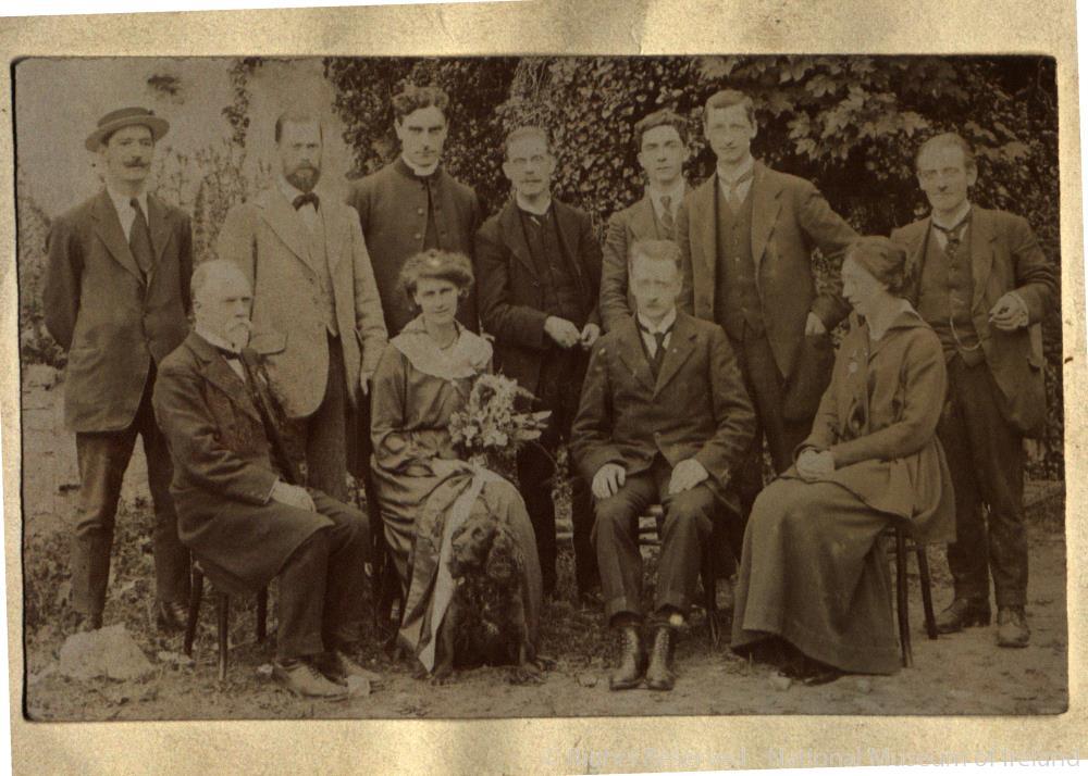 Countess Markievicz. Seated in group, probably 1917. Postcard photo including Eamon de Valera, William T. Cosgrave, Sean Milroy, Áine Ceannt and Count George Noble Plunkett. Pasted to little page of A Voice of Insurgency by Maeve Cavanagh (1916).;