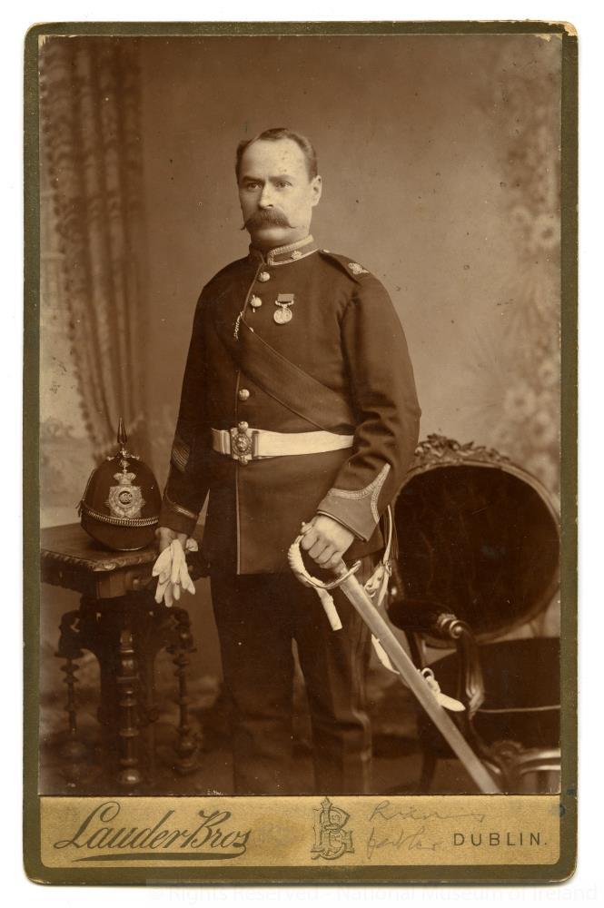 Photograph of William Joseph Mellows, father of Liam Mellows. Standing in military uniform, British Army, with helmet placed on the table to left. Photograph by Lauder Brothers, Dublin.;