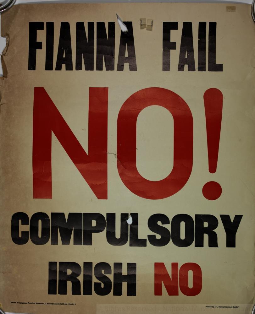 Poster issued by the Language Freedom Movement, 7 Mountpleasant Buildings, Dublin 6. Text: 'Fianna Fail/ No!/ Cumpulsory/ Irish No!' Printed by by J.L. Stewart Limited, Dublin 1.;