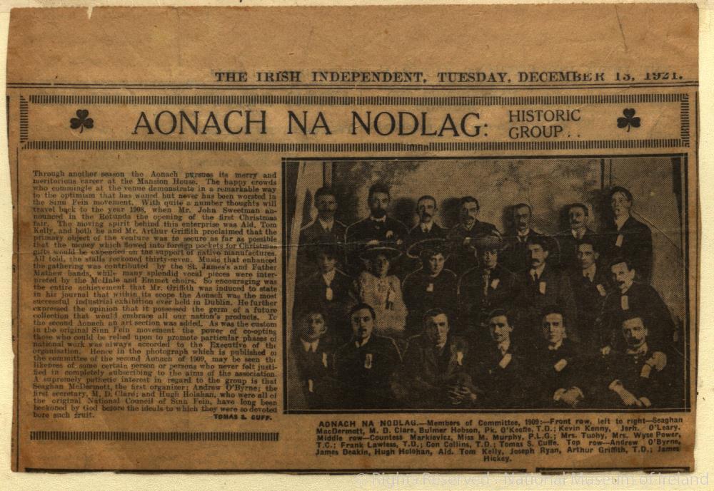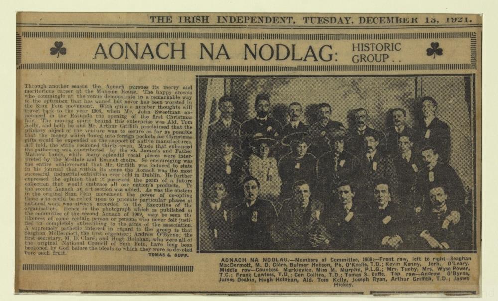 Newspaper page from the Irish Independent, Tuesday 13 December 1921. With a photograph titled Aonach na Nodlag Historic Group.;