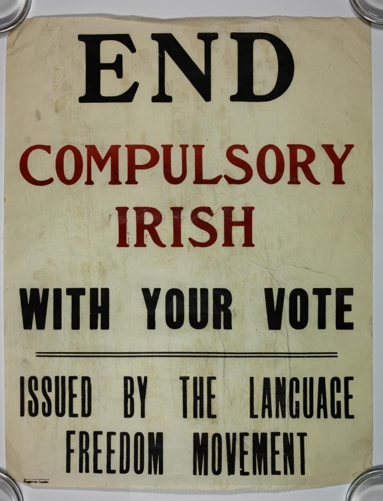 Poster issued by the Language Freedom Movement . Text: 'End Compulsory Irish With Your Vote/ Issued By The Language Freedom Movement'. Printed by the Dungarvan Leader. Length 57.3 cm x Width 44.5 cm.;
