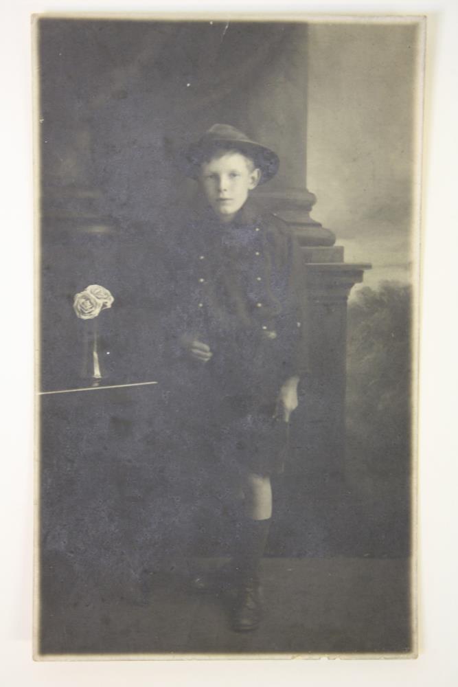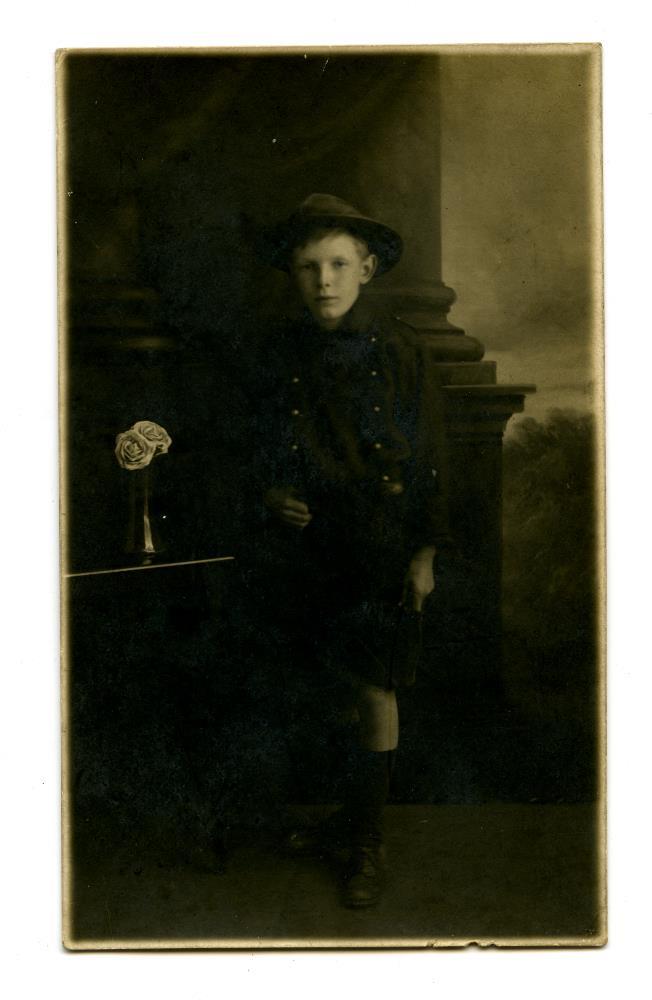 Postcard photograph. Young boy in Fianna Eireann uniform, probably Patrick Clare. One of a collection of photographs and postcards belonging / relating to Patrick Clare. Part of a collection of material belonging / relating to Patrick Clare, Irish Volunteer.;