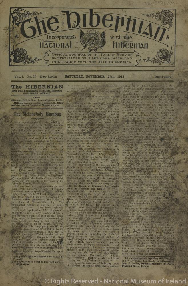 File of the Hibernian 1915/16 comprising issues of 26 June, 3, 17, 31 July; 7, 21, 28 August; 9, 16 Oct.; 27 Nov.; 11 Dec. 1915; 8, 15 Jan.; 5 Feb. 1916.;
