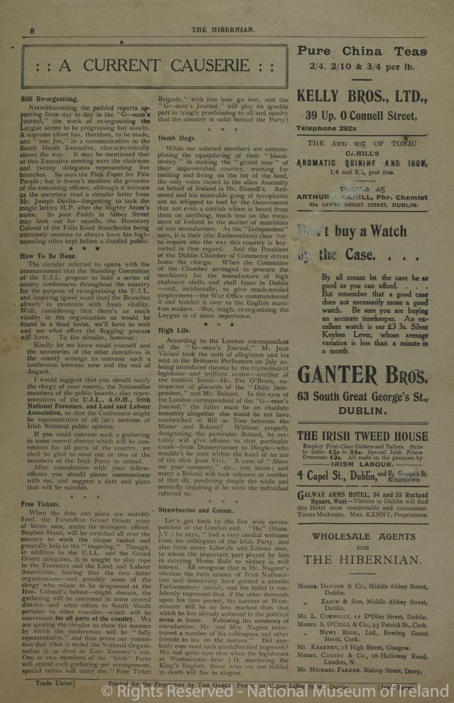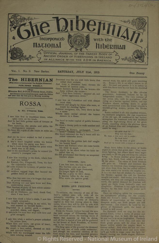File of the Hibernian 1915/16 comprising issues of 26 June, 3, 17, 31 July; 7, 21, 28 August; 9, 16 Oct.; 27 Nov.; 11 Dec. 1915; 8, 15 Jan.; 5 Feb. 1916.;