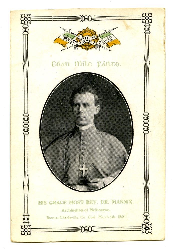 Postcard photograph of Reverend Dr Daniel Mannix, Archbishop of Melbourne, seated, with the legend 'Cead mile Failte' printed above, with the Sinn Fein Abu device.;