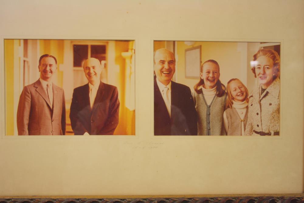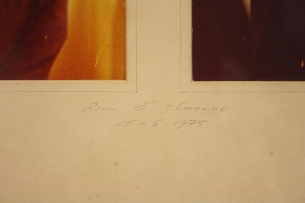 Photograph. Photograph of Cearbhall Ó Dálaigh and Pádraig Ó Mathúna's wife Siobhán and Niamh. Note: written underneath NMIHH:1998.4 (b-c) is 'Rinn Ó gCuanach 15-5-1975'. Length: 14.8 cm x Width 20 cm. HH:1998.4 (a-c) in same frame. Length 67 cm (of frame) x Width 56 cm.;