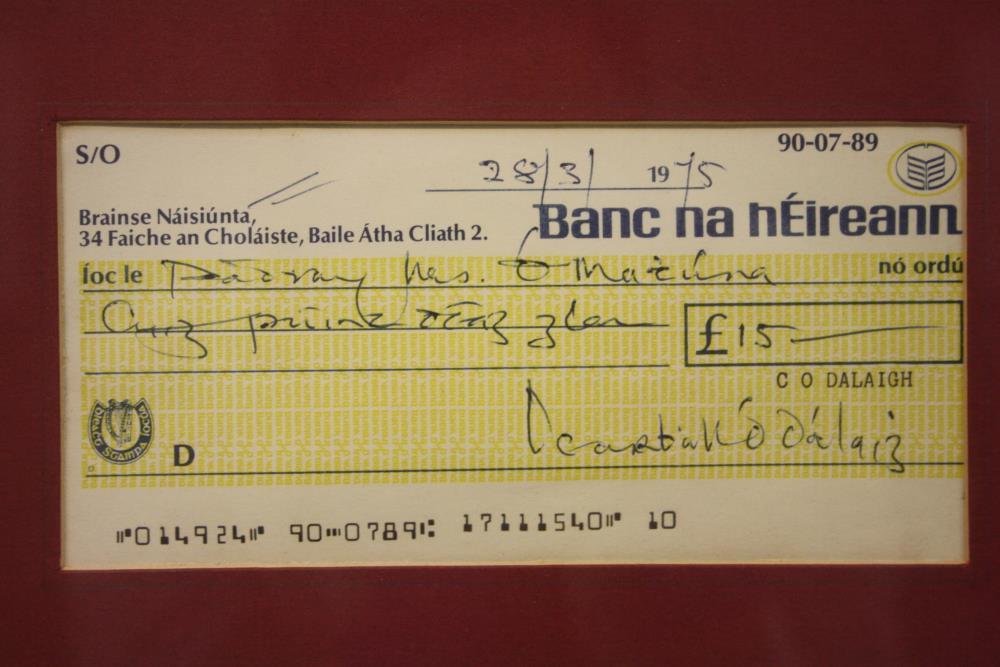 Cheque. 'Banc na hÉireann' cheque for £15 made out to Pádriag Ó Mathúna from President Cearbhall Ó Dálaigh. Dated 28/3/1975.;