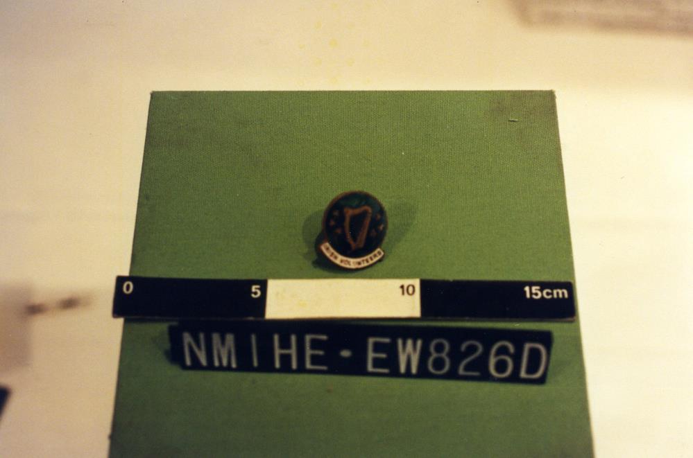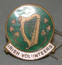 Badge, green and white enamel, of the Irish Volunteers. Gold harp in centre, surrounded by shamrock.;