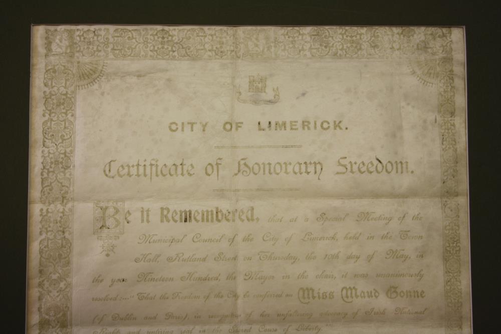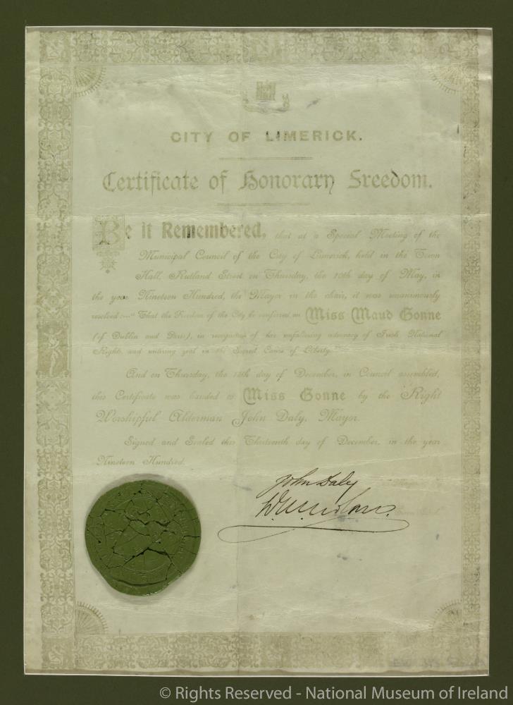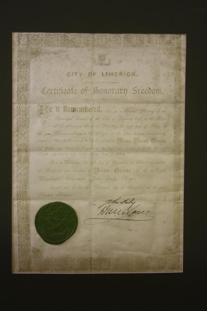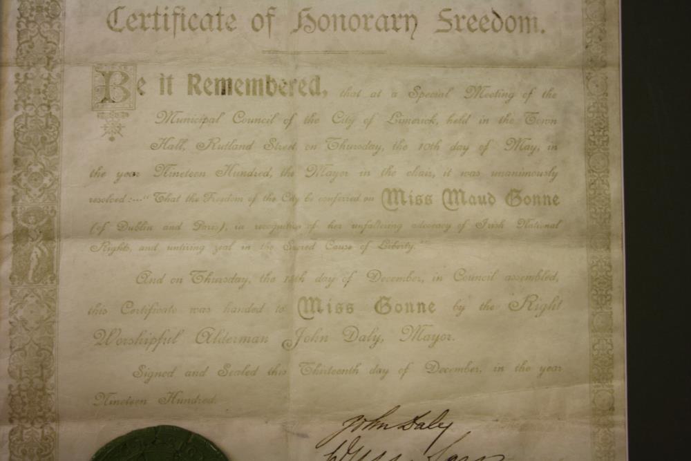 Certificate of Freedom of Limerick, Maud Gonne. Parchment conferring the freedom of the City of Limerick on Maud Gonne (the lender), presented to her by Mayor John Daly, 13.12.1900 in recognition of her work for the release of the Irish Treason Felony prisoners, and the carved oak casket (with inscription on silver plate affixed) in which the parchment is contained.;