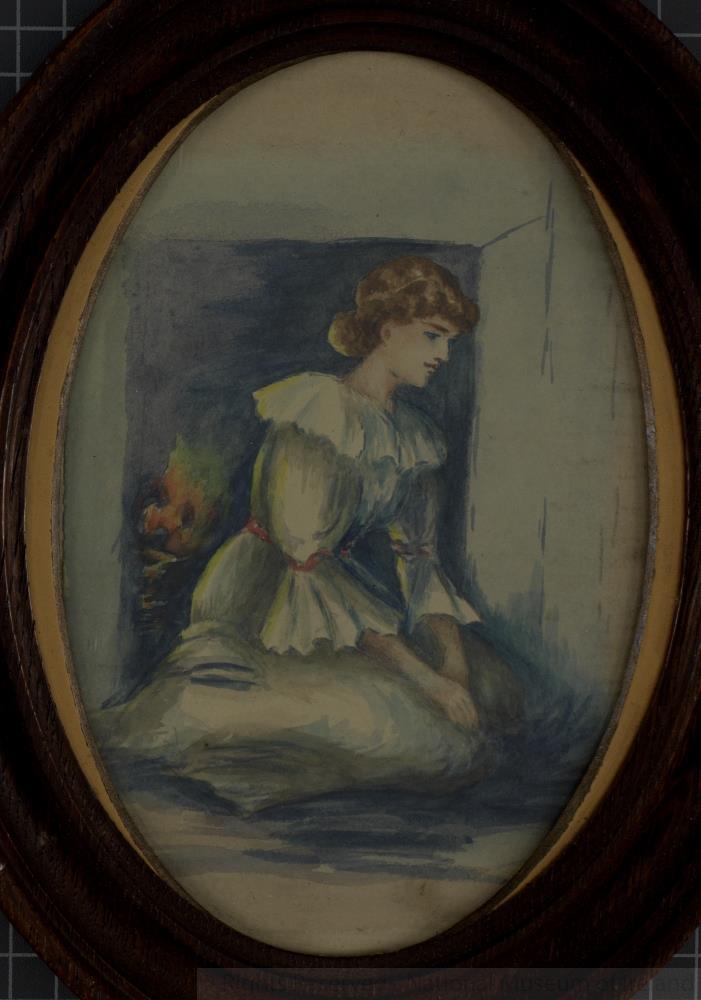 Framed water colour painting of Countess Markievicz. Copy, slightly enlarged and not painted directly from the original but from a photograph of it, of a water colour self-portrait of the Countess (age about 14 or 16, done at Glaslough, Co. Monaghan, seat of Sir John Leslie). Original is property of Sir John Leslie; both he and his father gave the Countess hints in painting. Sir John lent the original to Stanislas Markievicz and he had it photographed and copied in original colours by Mrs. R.S. Vandeleur, Westmeath. Size of original, c. 6 inches by 4 inches; of copy (oval), 5 1/2 inches by 8 inches.;