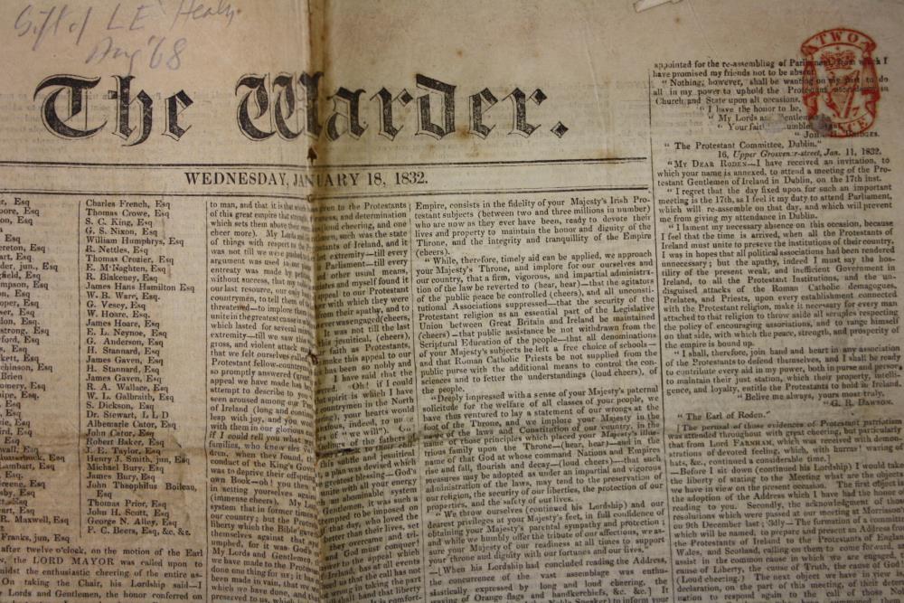 Copy of 'The Warder', 18 January 1832. Dublin Newspaper giving a full account of the Protestant/Orange meeting in the Mansion House on 17 January 1832.;