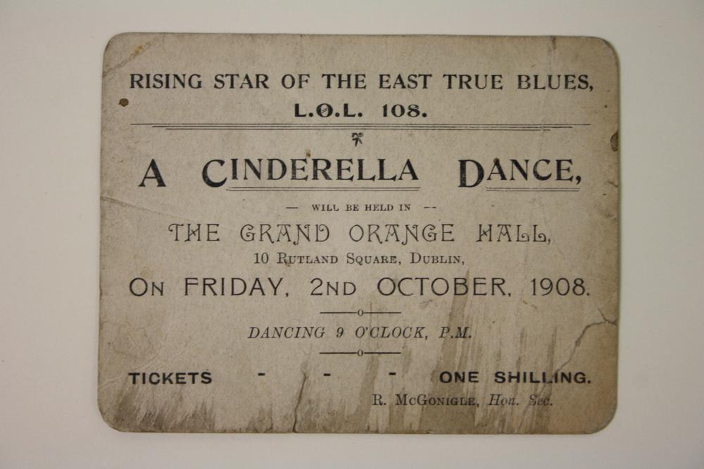 Orange Lodge Dance Ticket, Dublin 1908. 11.3 x 8.8 cm. White, printed black for dance at Grand Orange Hall, 10 Rutland Square on 2 October 1908 under auspices of Rising Star of the East True Blues, L.O.L. 108.;