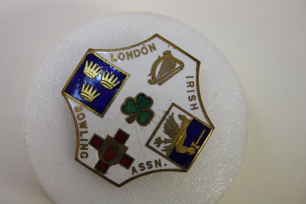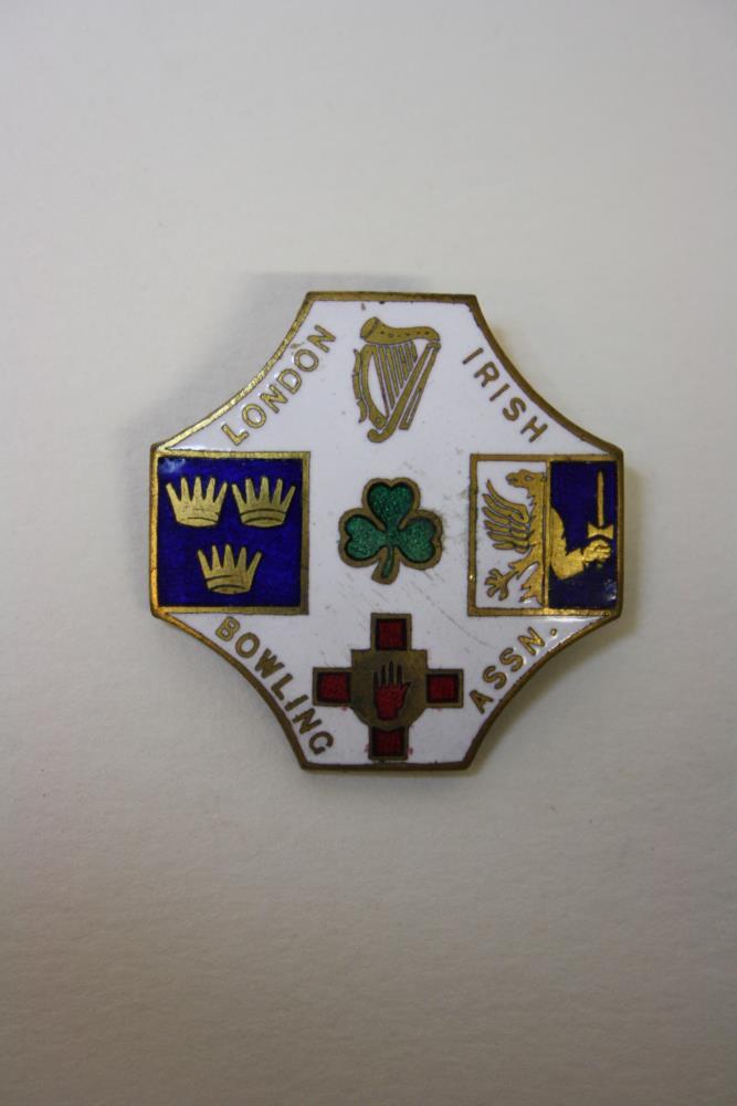 London Irish Bowling Association. Badge, bronze enamelled with pin at back for attachment. Stamped on back, L. Simspn, (London) Ltd., probably dates to c. 1900 (No indication as to provenance).;