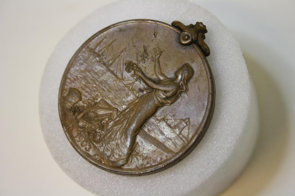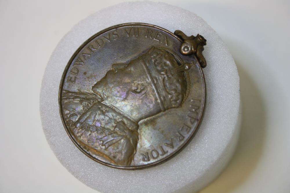 1903 Commemoration Medal. OBV: Crowned head of King looking to left. Around above, 'Edwardus VII Rex Imperator'. Signed at truncation, D + S. REV: A draped female figure holding a wreath in her outstretched left hand - her right raised in welcome - with a harp at her feet, standing at a pier head. A ship in the background. In exergue, 1903. Bronze, circular, cast, diam. 3.5 cm. Engraved on rim: C.C. Breadon. R.I.C. Fragments of suspending clasp.;