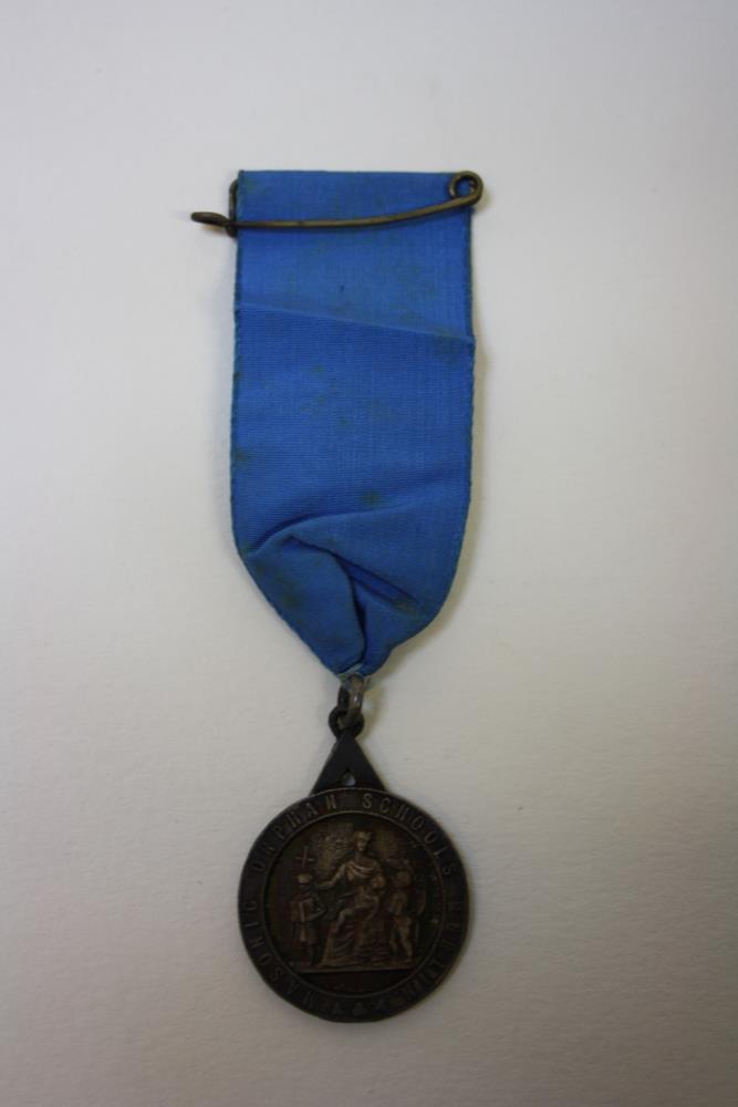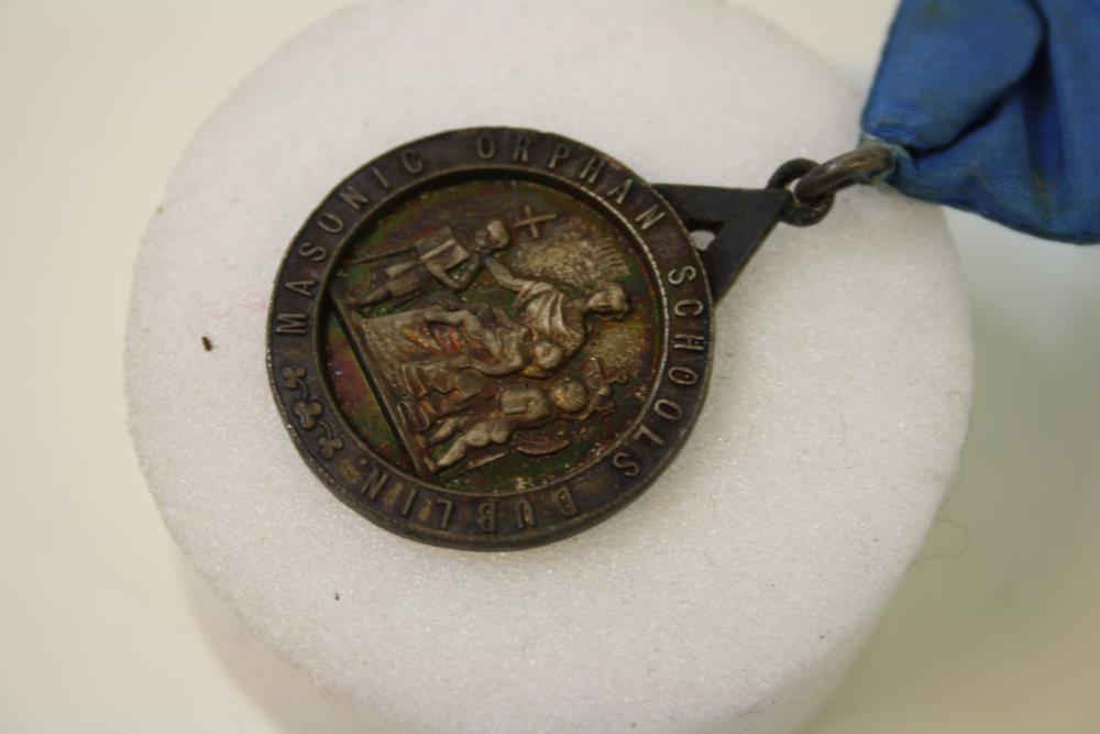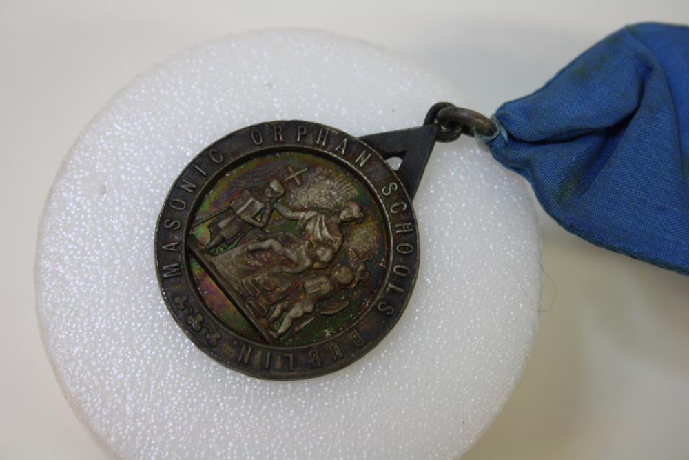 Masonic Orphan School Medal. REV: blank. OBV: on a raised border around 'Masonic Orphan Schools Dublin', with a treble trefoil at the terminal. Within, a seated female figure holding a naked baby on her lap with her left arm, her right resting on the shoulder of a standing female child who is holding a book and behind whom is a cruciform topped staff. To right, a nude male child holding a book in his left arm, his right reaching for a key over his head. Behind him, a box and a spade. Silver 1 inch diam. surrmounted by triangular arch out of which is a loop for suspension. Out of the loop, a ring at the end of a length of blue ribbon. Signed under the ridge marking the exergue JW for John Woodhouse. A Masonic Orphan School prize medal, c. 1885.;
