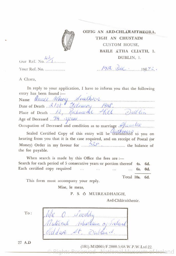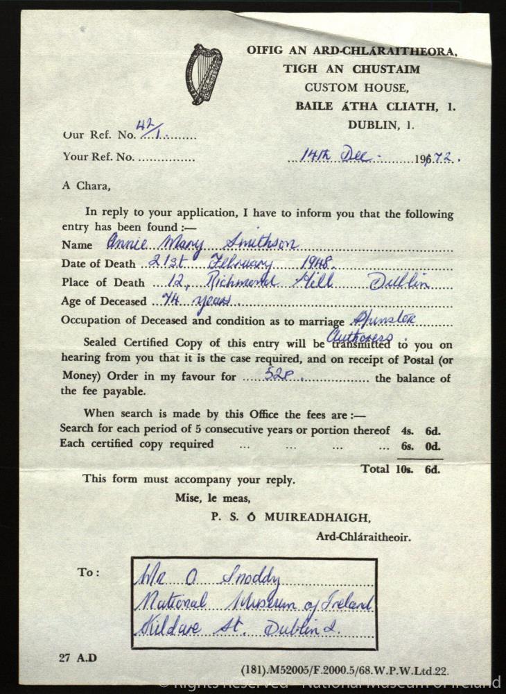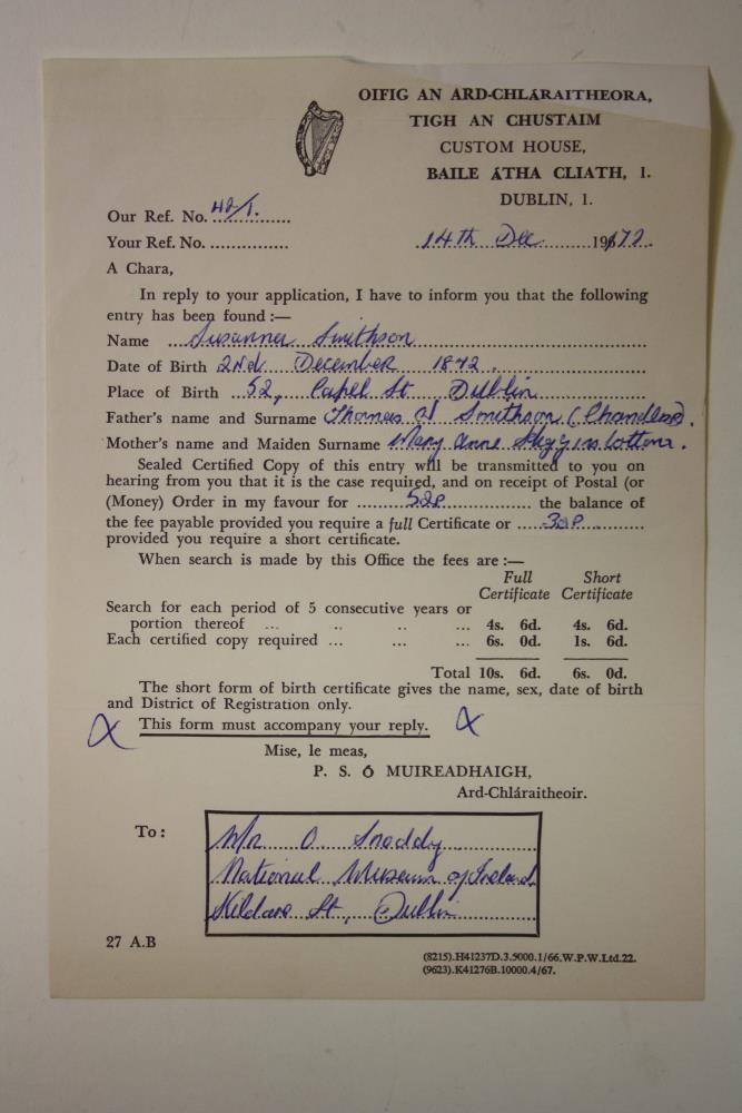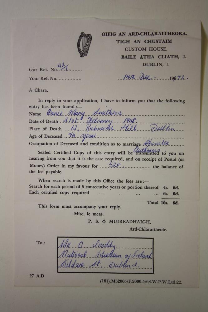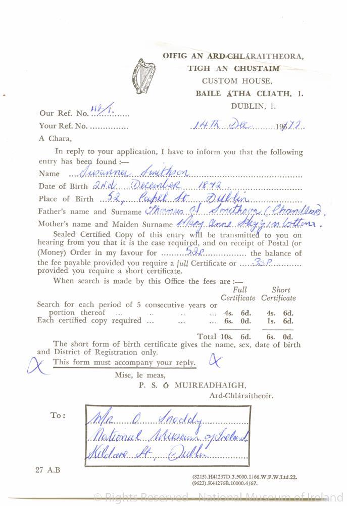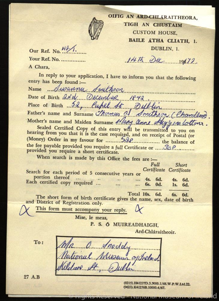 Susanna Smithson and Annie Mary Smithson, reports on registrations of birth and death of. Ordered by Oliver Snoddy, NMI.;