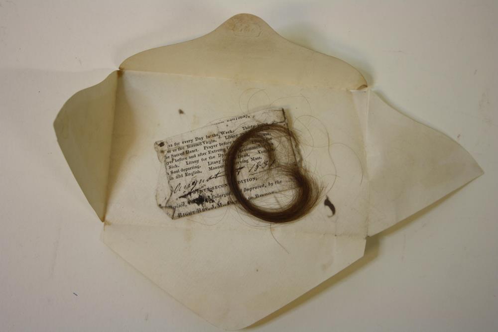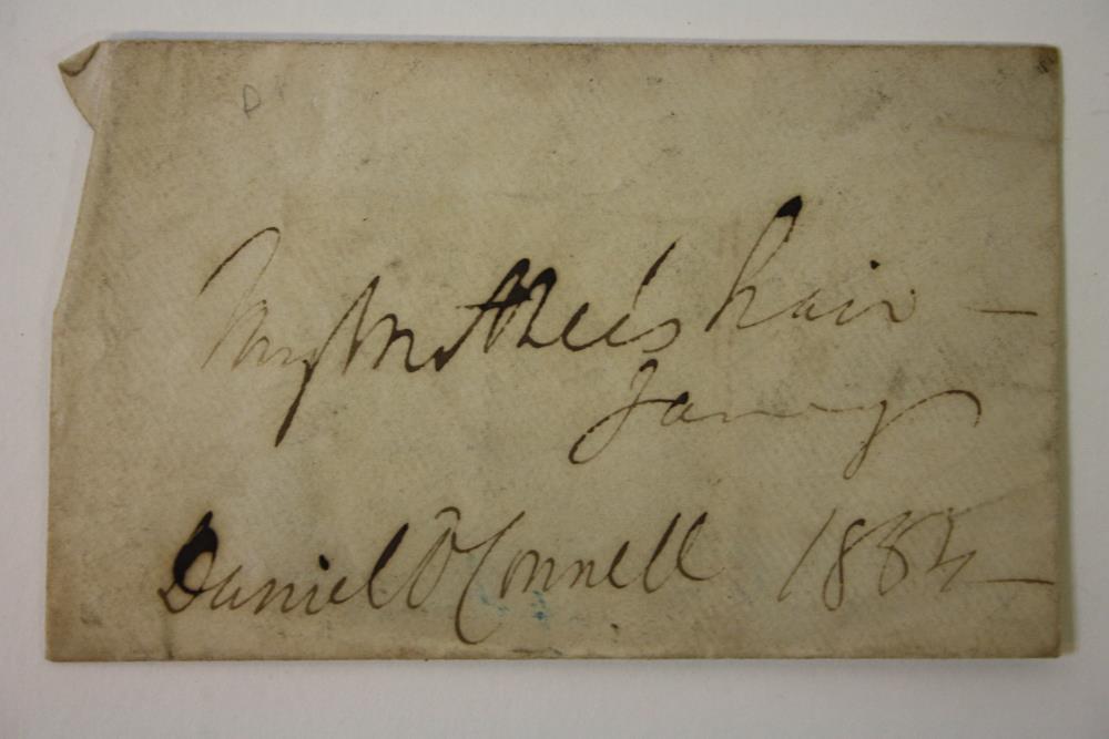 Daniel O'Connell, a holograph note on the cover of an envelope, reading 'My Mother's Hair/January /Daniel O'Connell 1834' (last two digits unclear). Envelope embossed 'DOC' on the back flap, enclosing a rib of hair in a page from an 1826 prayer book signed 'Hannah Connell, 30 Merrion Square South, August 11th (?) 1831'.;