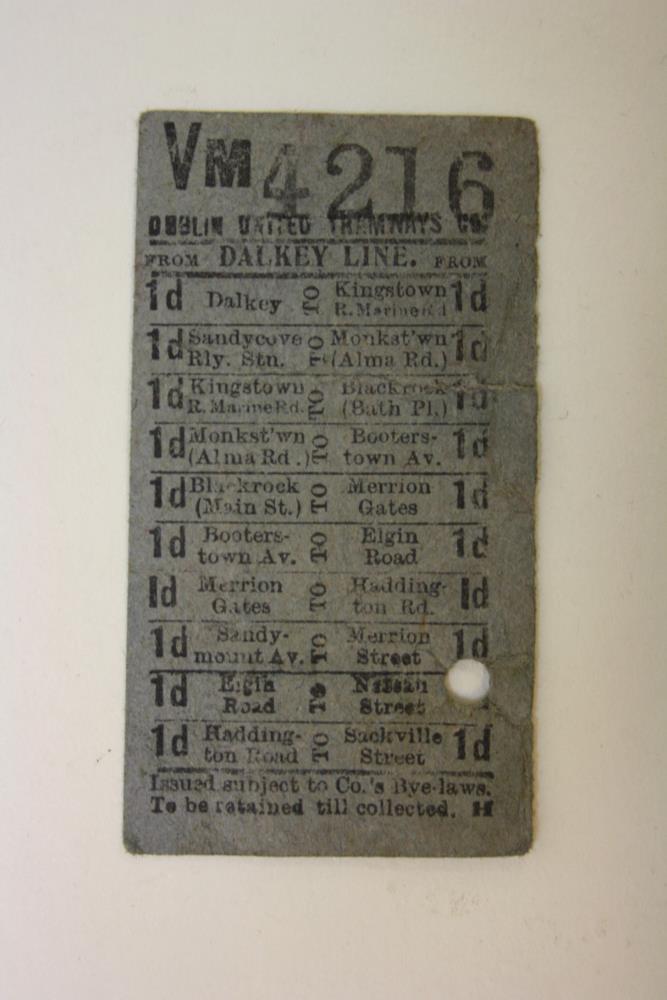 Dalkey Line tram ticket c.1910. Dublin United Tramways Company. No.VM4216. Pale blue in colour.;