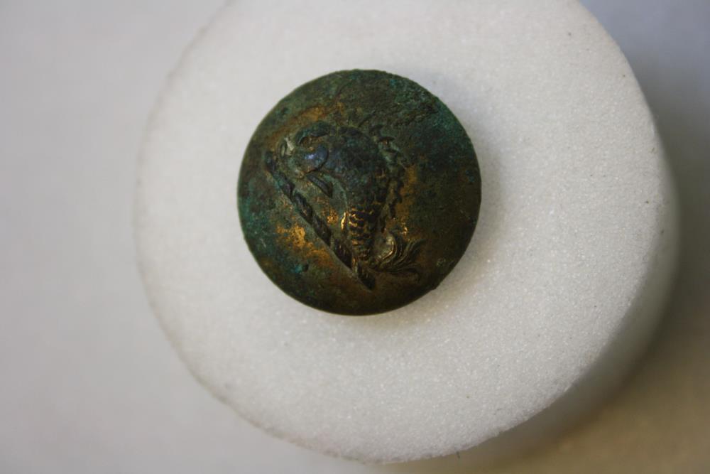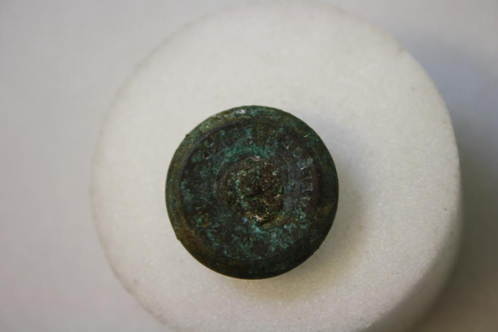 Livery buttons, c. 1890. Domed brass depictin a dolphin. Makers name, ? Comyn, and address College Green, Dublin on base. Found at Cuffe St./Stephen's Green road widening works.;