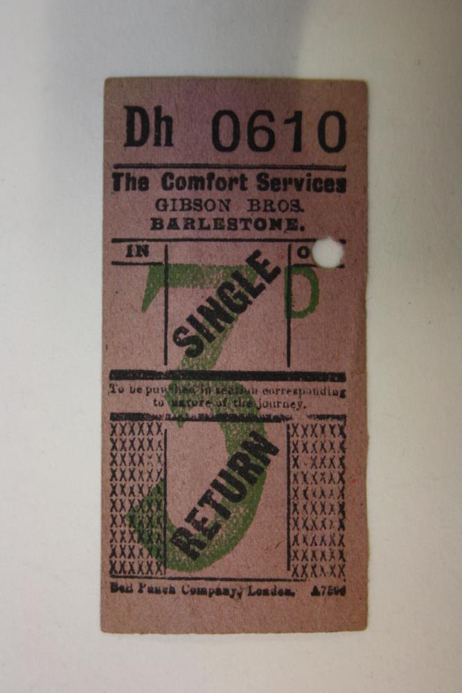 Bus ticket, c. 1940. Issued by "The Comfort Services/Gibson Bros./Barlestone"/ 3d fare, punched for outwards single journey.;