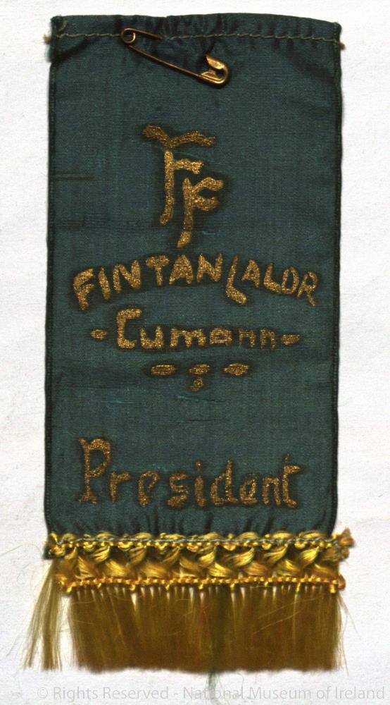 Fianna Fáil ribbon, c. 1950. Green with yellow fringe with 'F/F/FINTAN LALOR/-CUMANN-/PRESIDENT' across in gold.;