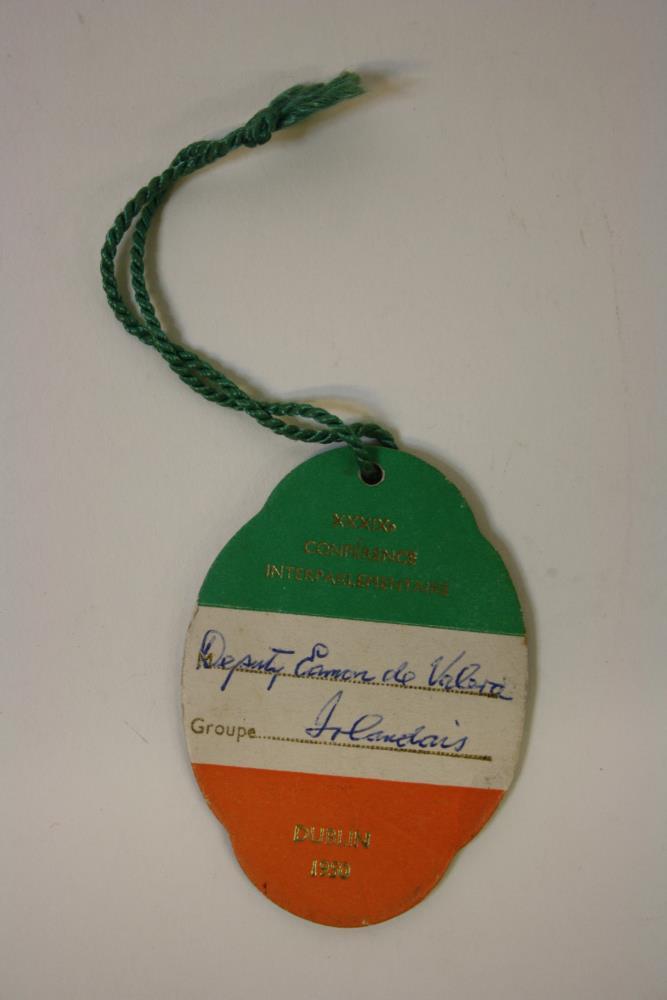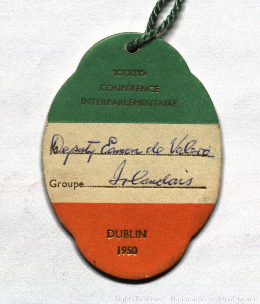 39th Interparliamentary Conference in Dublin, 1950. Delegate's card badge with string attachment made out in name of Eamon de Valera.;