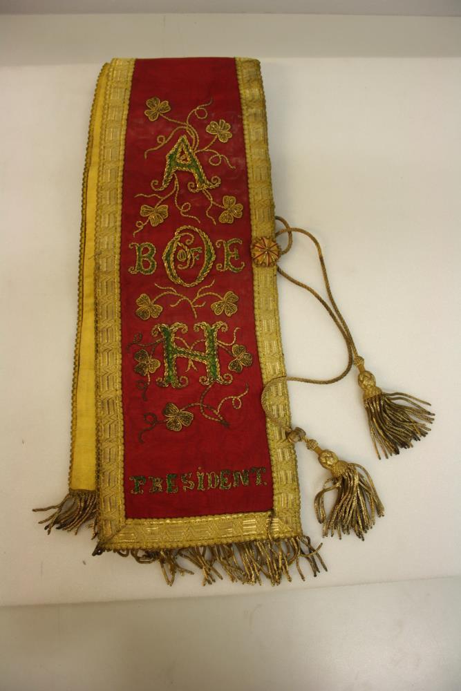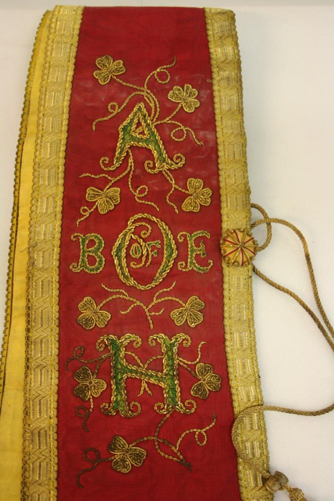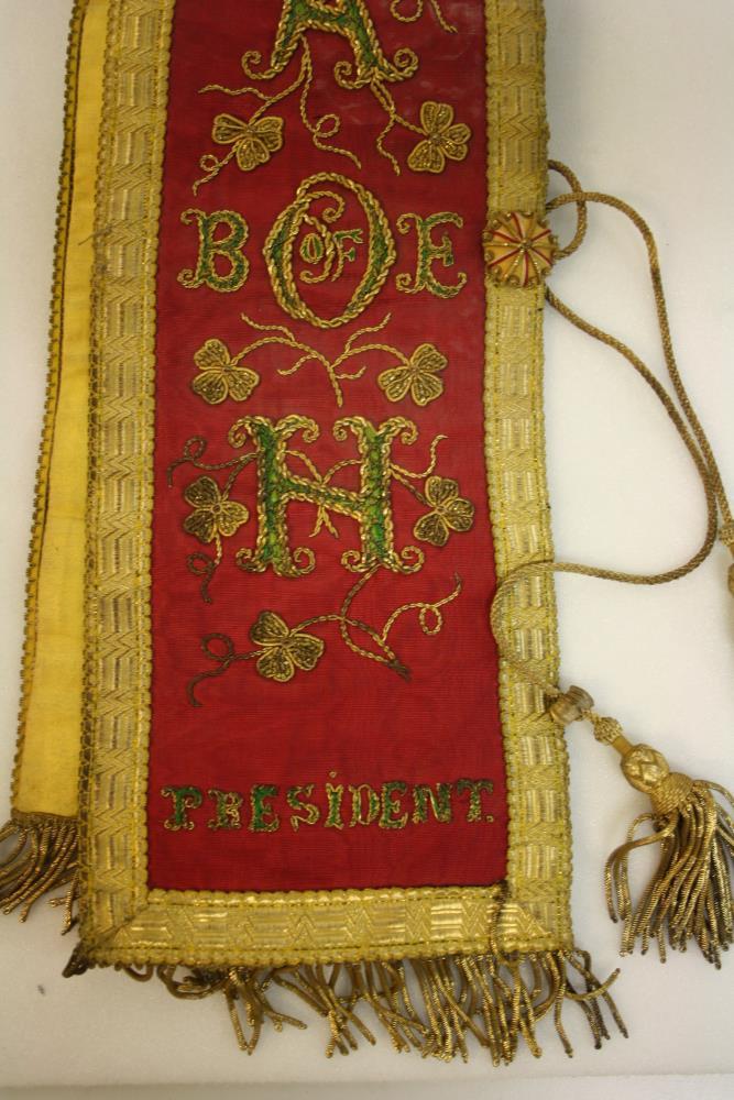 Ancient Order of Hibernians Divisional President's sash. In red poplin, backed saffron, with gilt metal thread border fringes. On one side in raised green cloth and gilt metal thread applique L over a harp separating DIV./895 over C over ST. PAT'S. with trefoils in gilt metal thread about. On the other side A over O (with B and E on either side and OF within) over H over PRESIDENT. Twin tassle in gilt metal thread.;