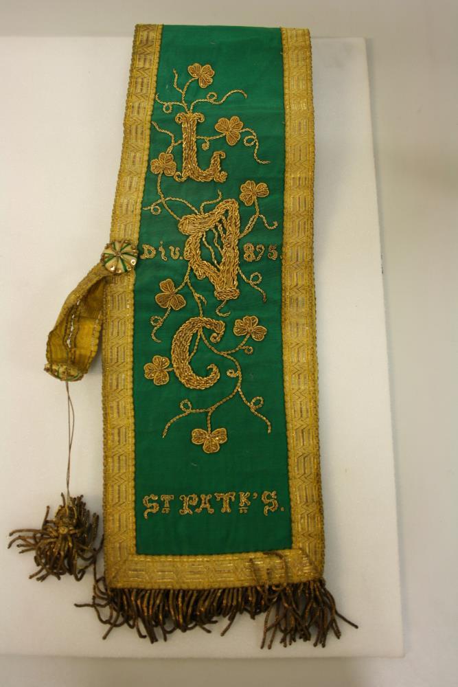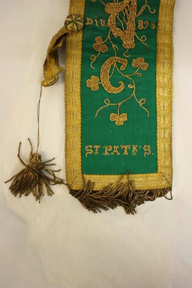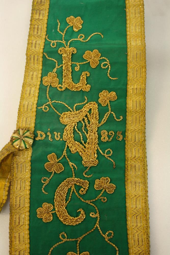 Ancient Order of Hibernians Record Secretary's sash. In green poplin, backed saffron, with gilt metal thread border and fringes. On one side in raised gilt metal thread applique A over O (with B and E on either side and OF within) over H over REC.SEC. with trefoils in gilt metal thread about. On the other L over a harp separating DIV./895. over C over ST. PATK'S. Single tassle in gilt metal thread.;