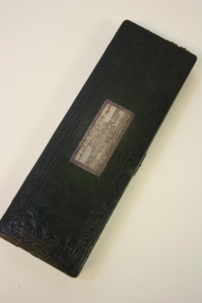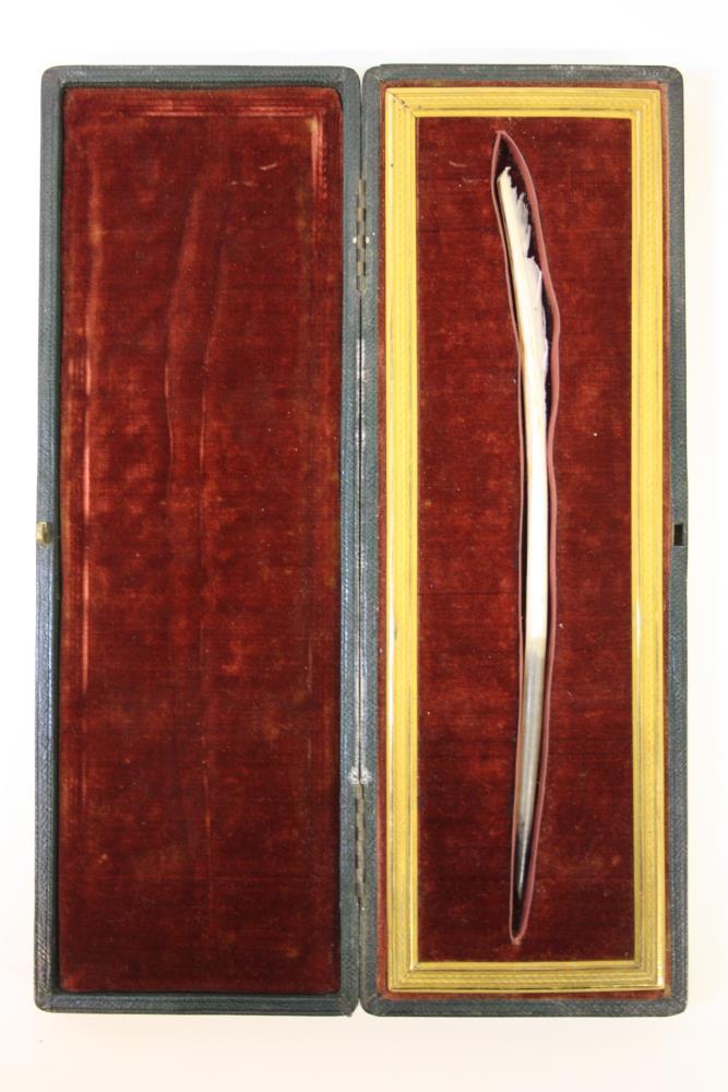 Quill pen in case, relating to Daniel O'Connell's dismissal as MP, 1836. Quill pen in leather bound case bearing a silver plate on which is engraved "In the House of Commons/on the Evening of Monday the 16th of May 1836/The Clerk of the Crown;/ERASED WITH THIS PEN:/THE NAMES OF DANIEL O'CONNELL & EDWARD S. RUTHVEN./from the Election Return for the City of Dublin,/in which they had wrongfully inserted;/on the 17th of January 1835./ and by command of the SPEAKER inserted those of/GEORGE ALEXANDER HAMILTON & JOHN BEATTY WEST ESQRS". The donor was a grandson of Lady Gregory.;
