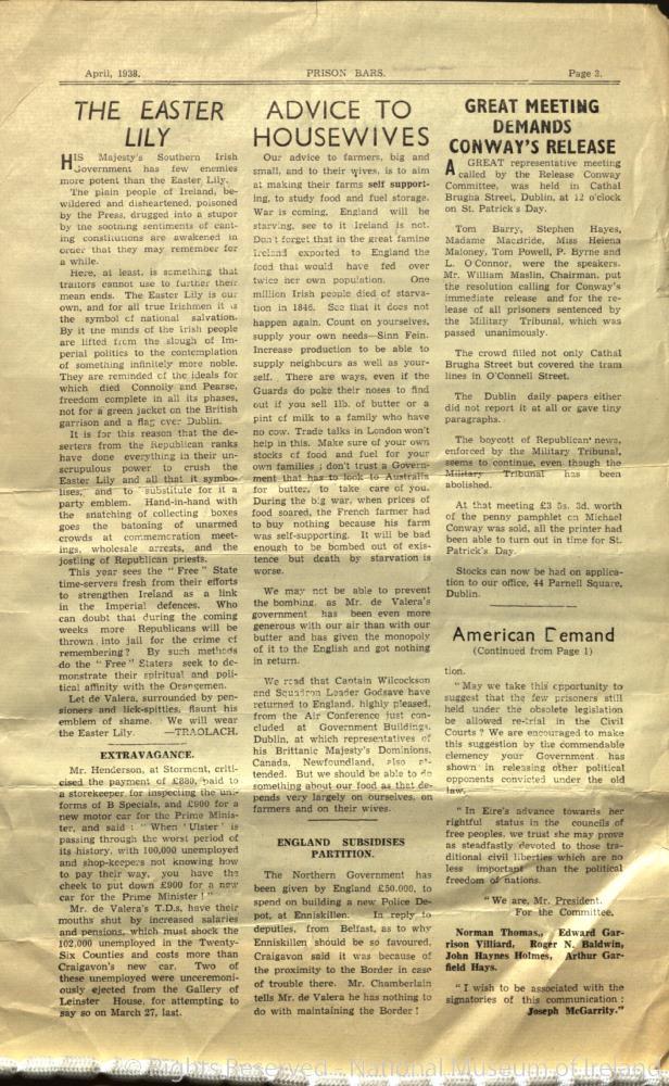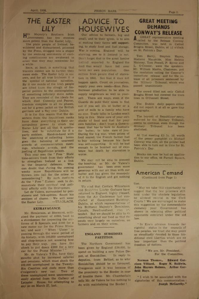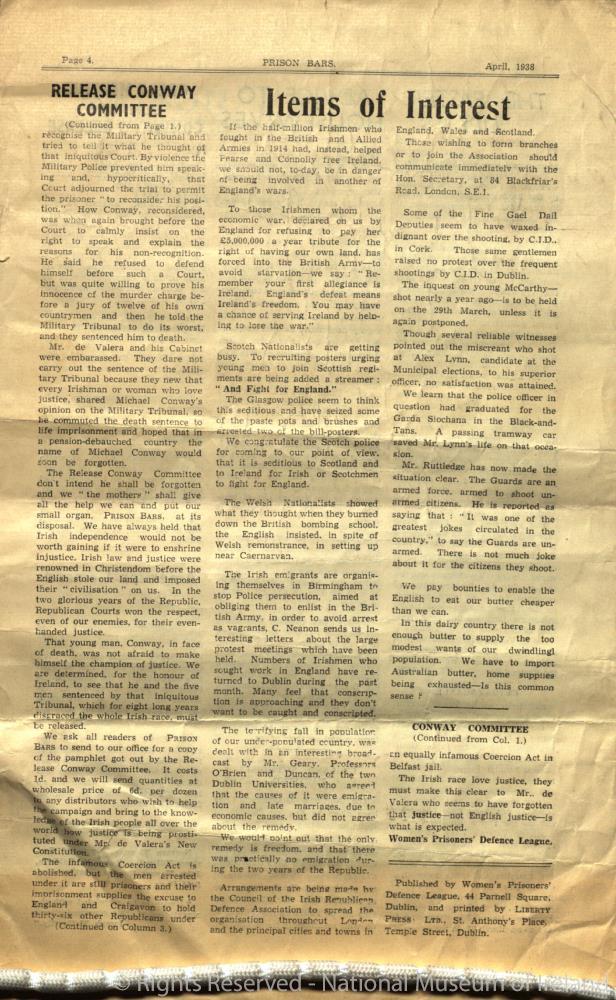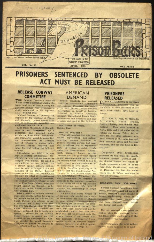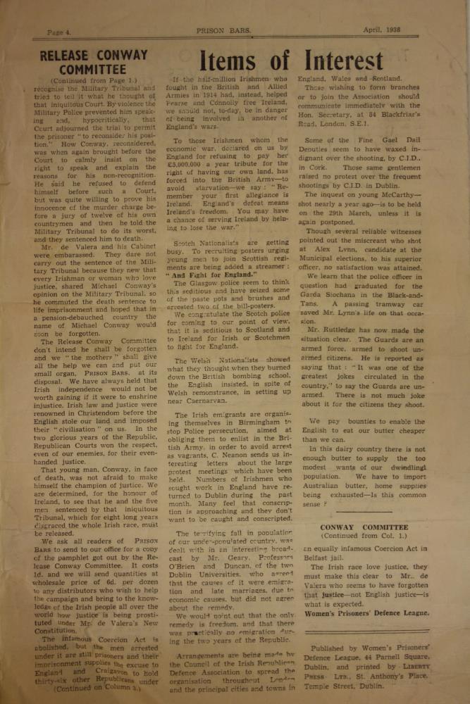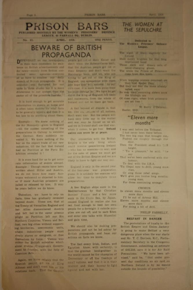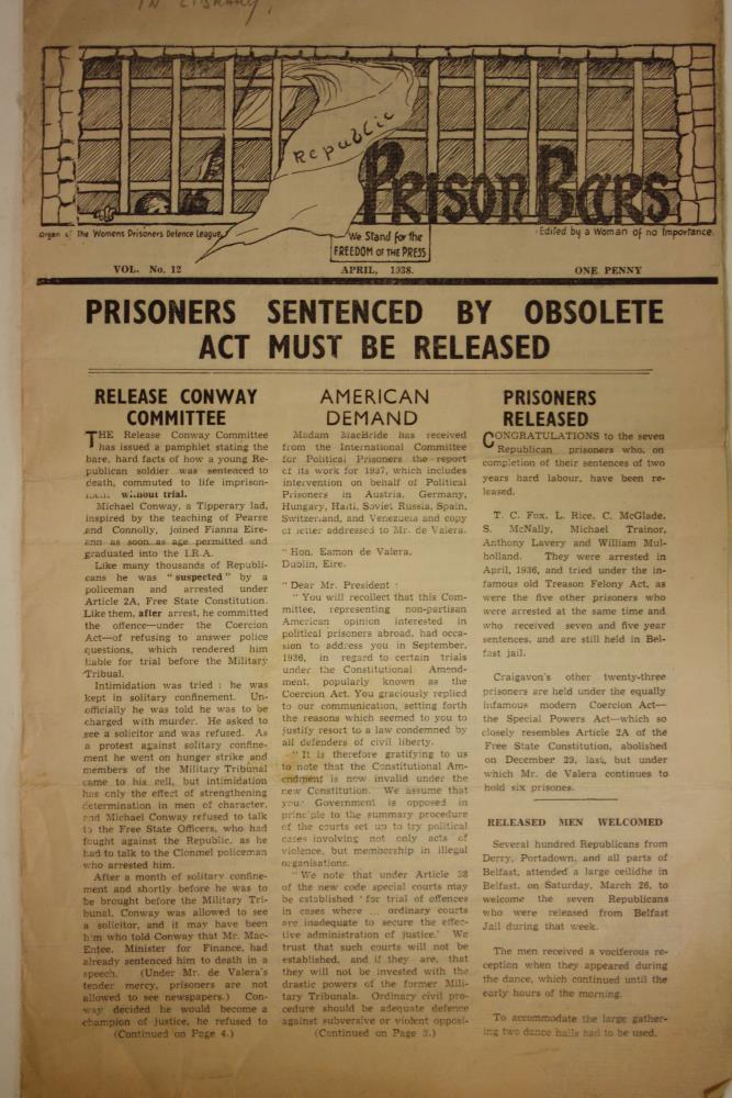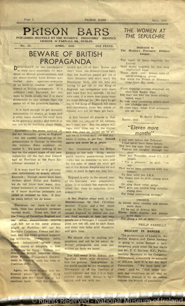 'Prison Bars' publication, No. 12, April 1938. Organ of the Women's Prisoners' Defence League. From NLI, ex Joseph McGarrity papers, on 28.3.1979.;