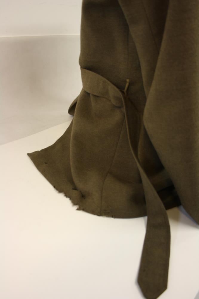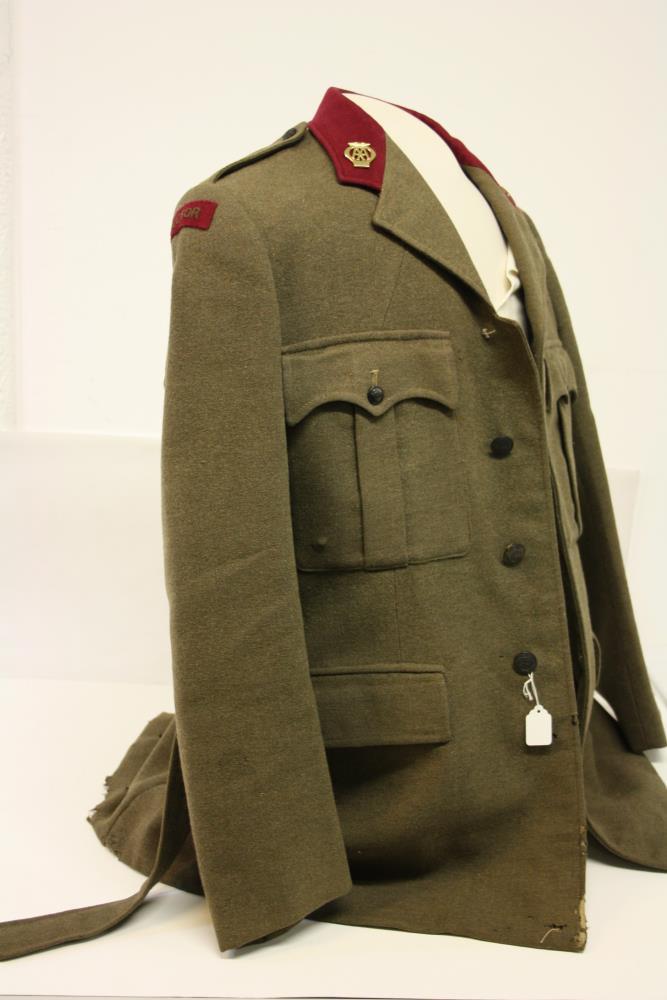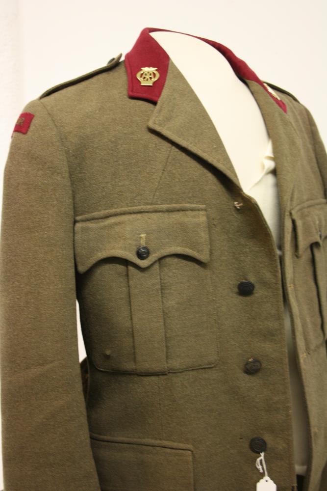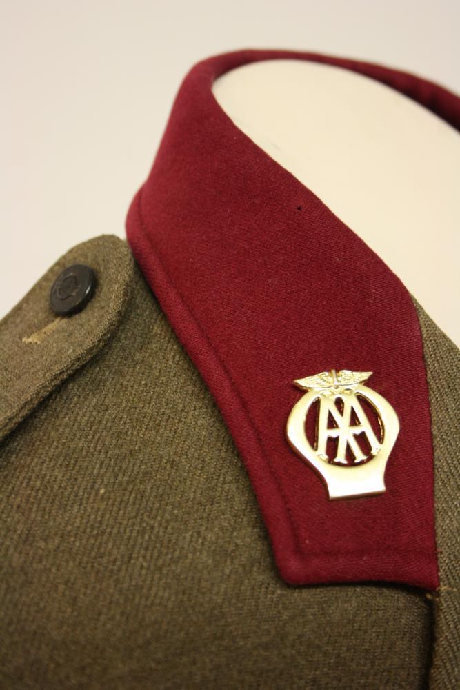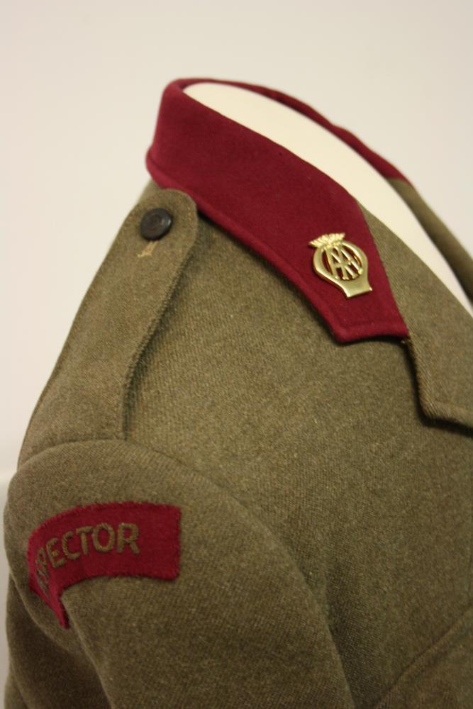 AA Inspector's Uniform, c. 1950. Khaki comprising Tunic and Riding Breeches. Maroon collar and shoulder flashes, black composition buttons bearing the AA (Automobile Association) device, bronze collar badge on either collar, and leggings.;