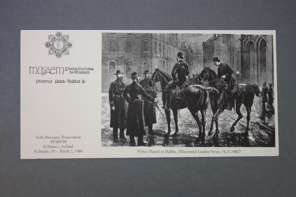 Police Patrol, Dublin, 1882. Reproduction of ILN illustration dated 16.12.1882, as postcard issued by Musaem Gharda Siochána na hÉireann. Irish Museums Association invitation card.;