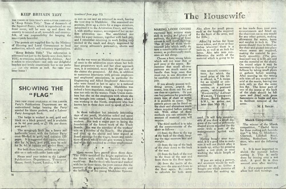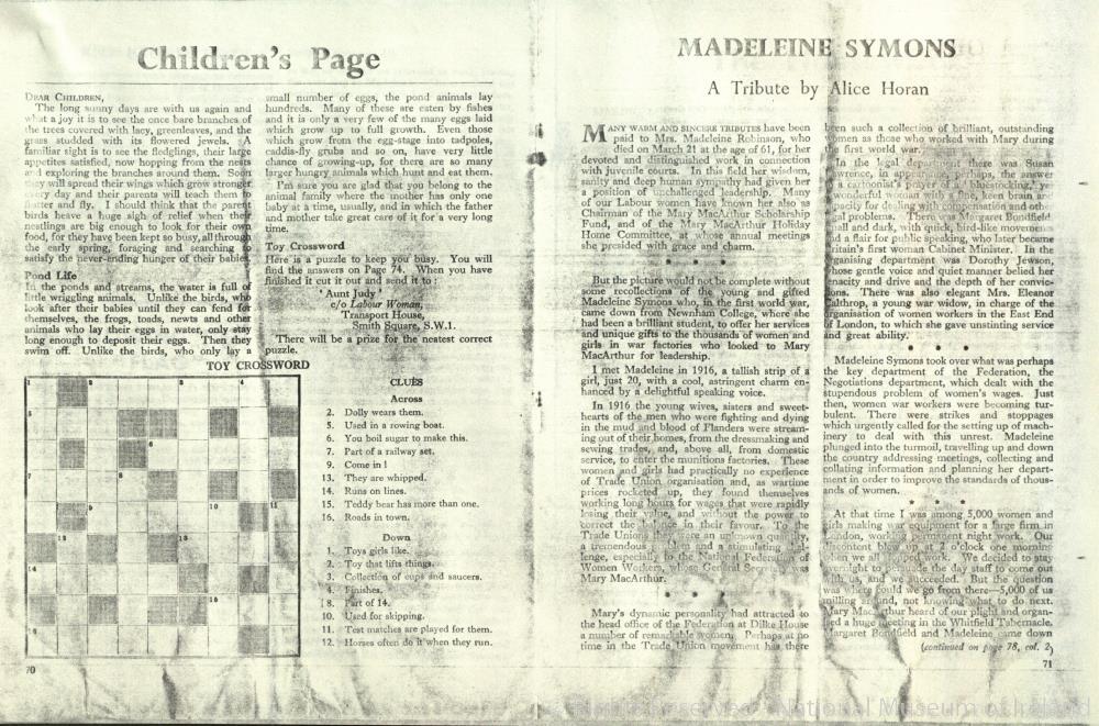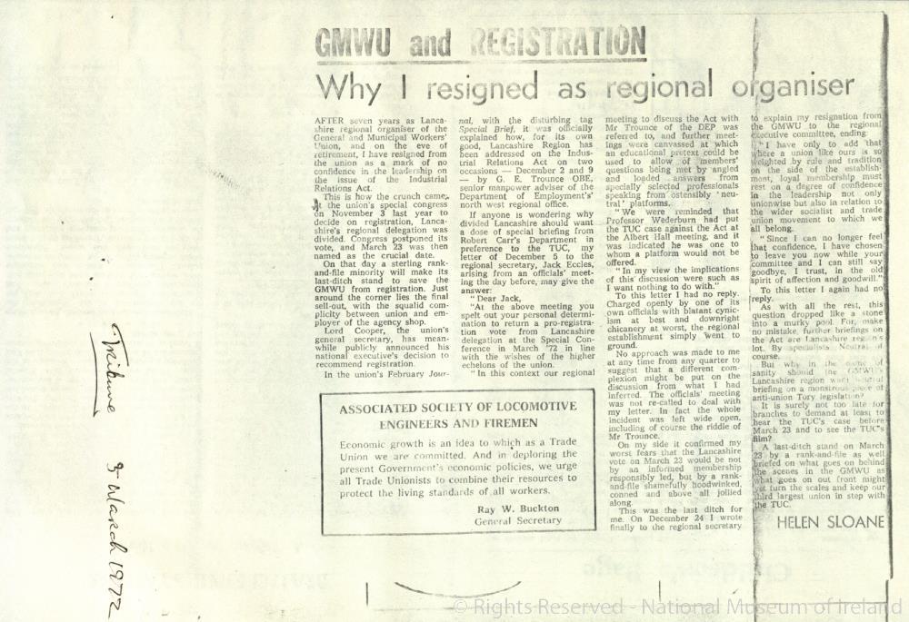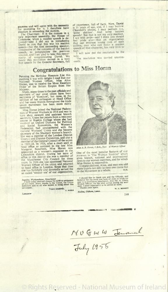 Alice Horan. Article re Irish born Union Organiser ex NUGMU Journal, July 1955. Photocopy.;