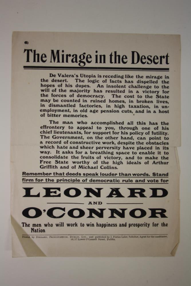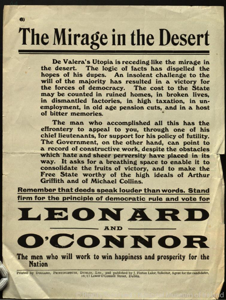 'The Mirage in the Desert'. No. 6 in a series of pro-Government propaganda handbills in the 1925 North Dublin Bye-Election. Advocating the vote for Cumann na nGaedheal candidates Patrick Leonard and Donal O'Connor. Printed by Dollard of Dublin, published by James Fintan Lalor, Solicitor and Agent for the Candidates, Dublin.;