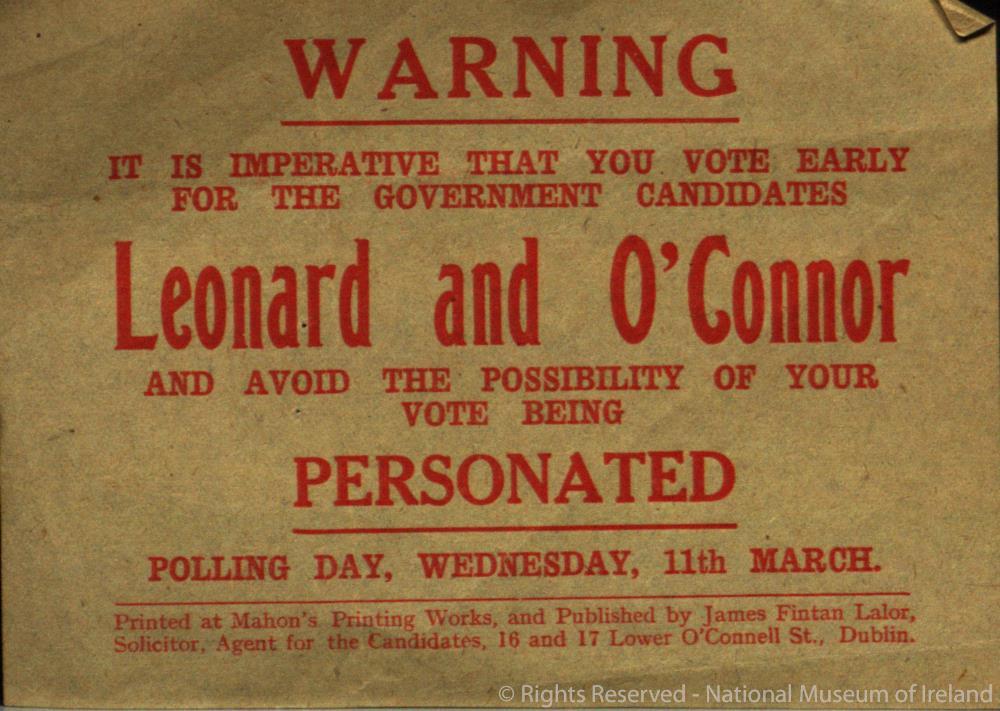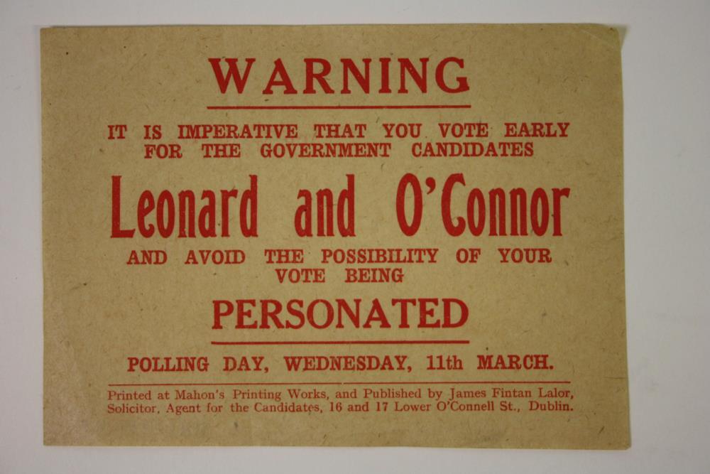 Leaflet, 'Warning, it is imperative that you vote early for the candidates Leonard and O'Connor and avoid the possibility of your vote being impersonated'. Government propaganda handbill supporting their candidates Patrick Leonard and Donal O'Connor, Cumann na nGaedheal, in the 1925 North Dublin By-Election.;