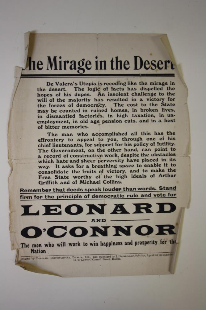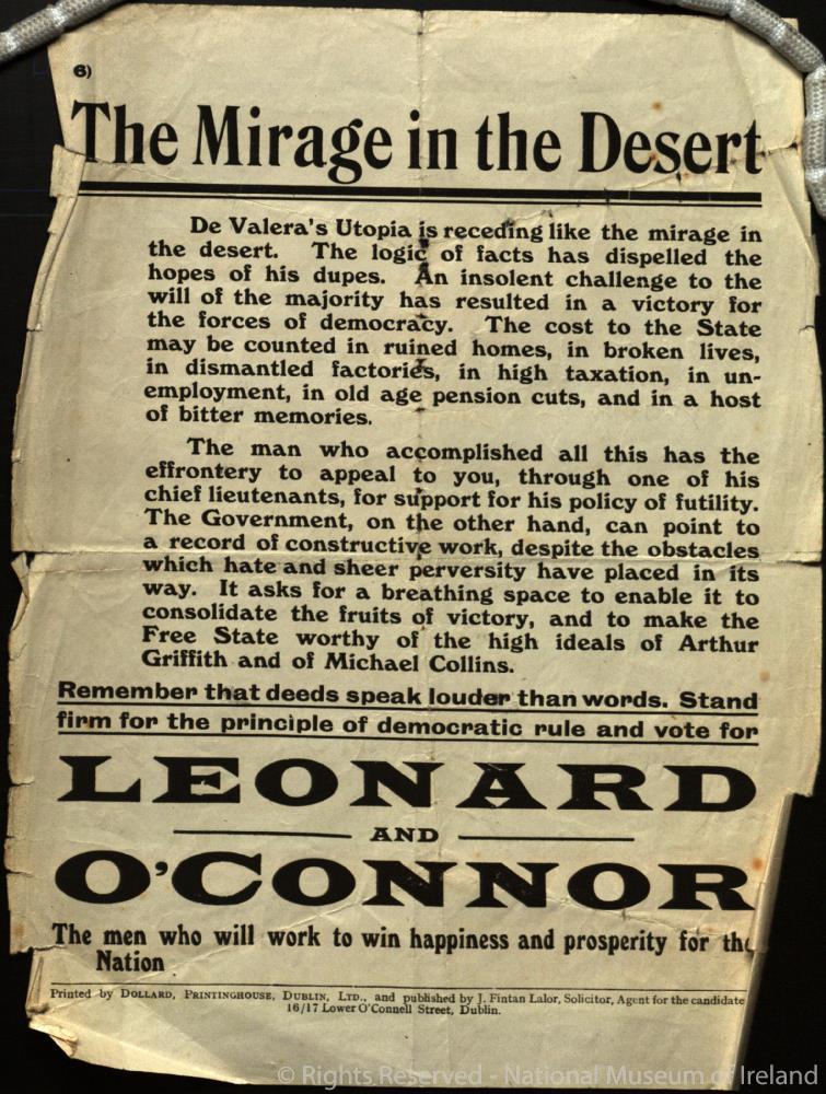 'The Mirage in the Desert'. No. 6 in a series of pro-Government propaganda handbills in the 1925 North Dublin Bye-Election. Advocating the vote for Cumann na nGaedheal candidates Patrick Leonard and Donal O'Connor. Printed by Dollard of Dublin, published by James Fintan Lalor, Solicitor and Agent for the Candidates, Dublin.;