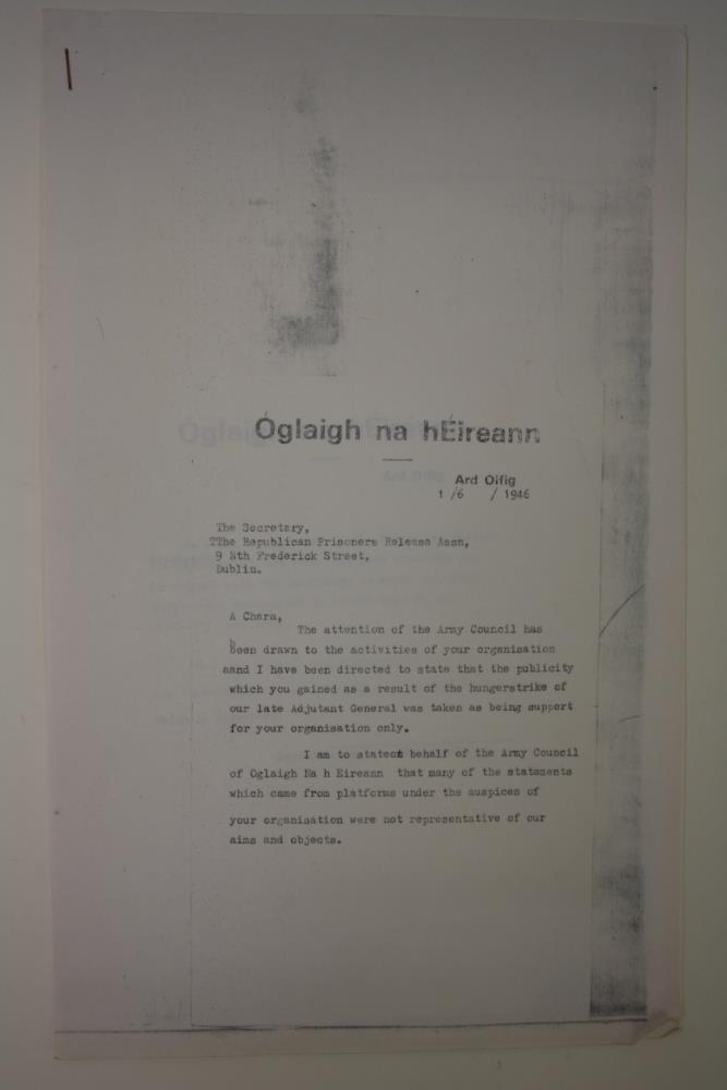 Irish Republican Army letter, 1946. Xeroxcopy of 2pp. letter distancing themselves from the Republican Prisoners Release Association.;