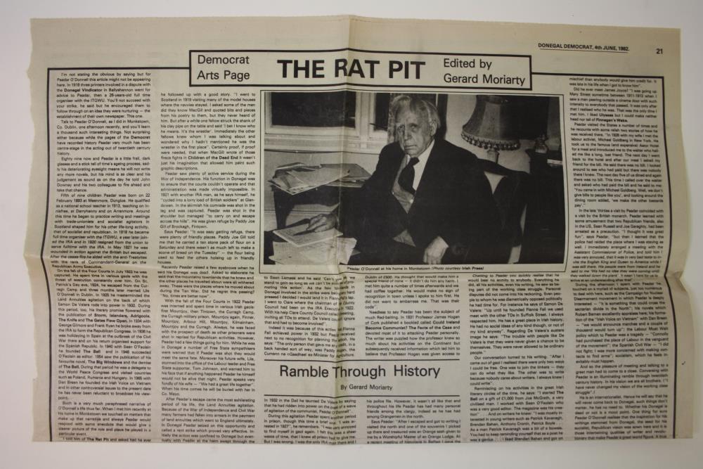 Peadar O'Donnell. One page newspaper article from the Donegal Democrat 4 June 1982.;