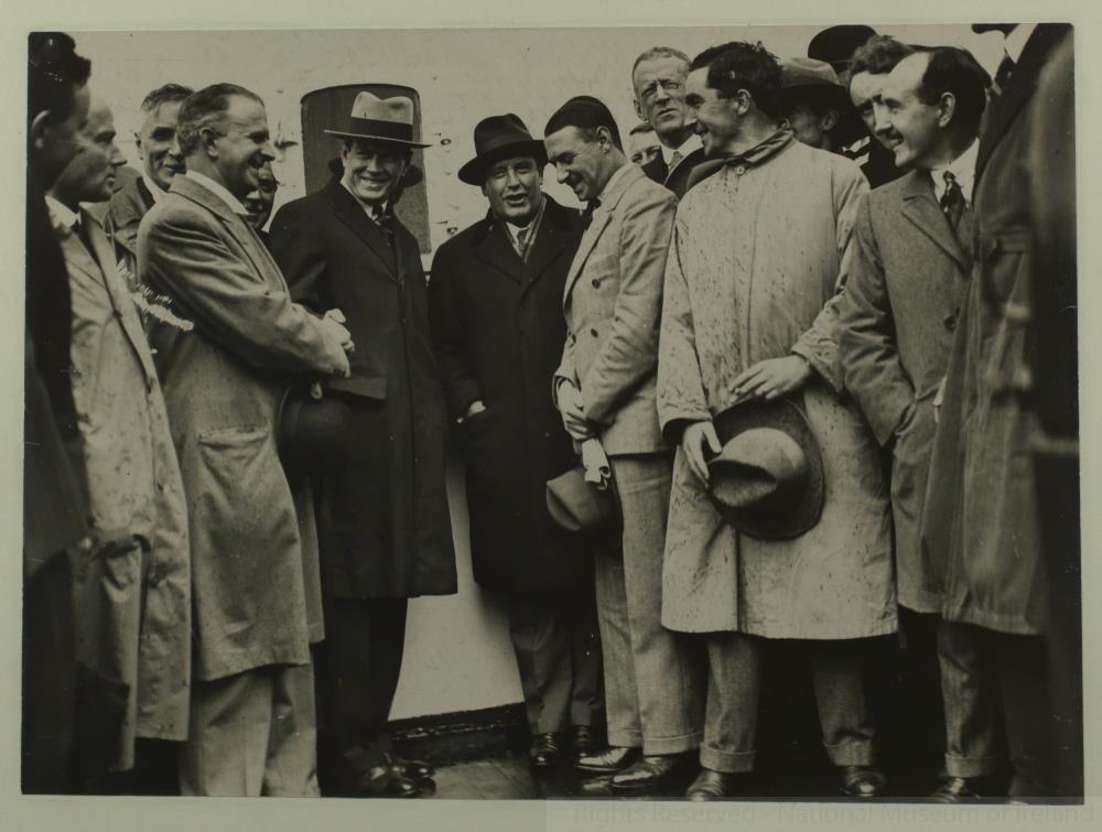 Visit of American boxer Gene Tunney to Ireland, c. 1928. Mounted Cashman print showing reception group O'Duffy shaking his hand, Count John McCormack and Colonel FitzMaurice, among others, to the right.;