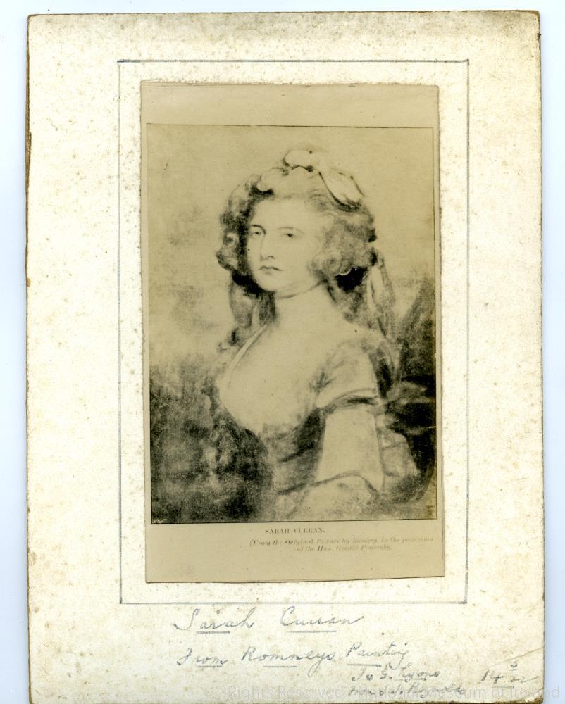 Sarah Curran. Mounted half plate photograph from Ronney's painting signed "To G. Lyons from J.J. Reynolds 14.3.1922".;