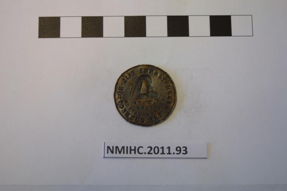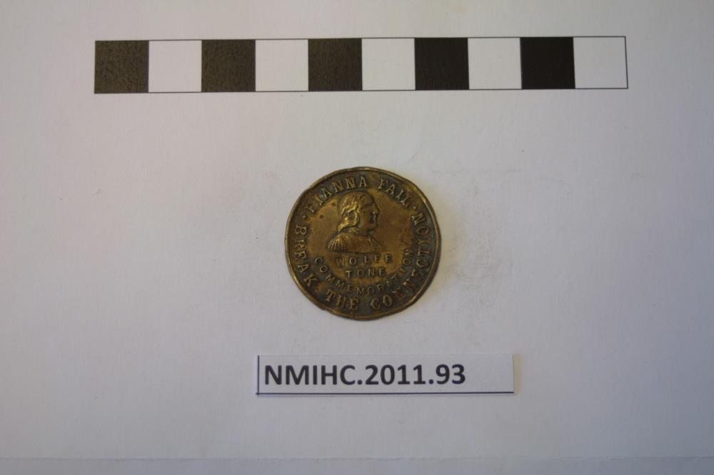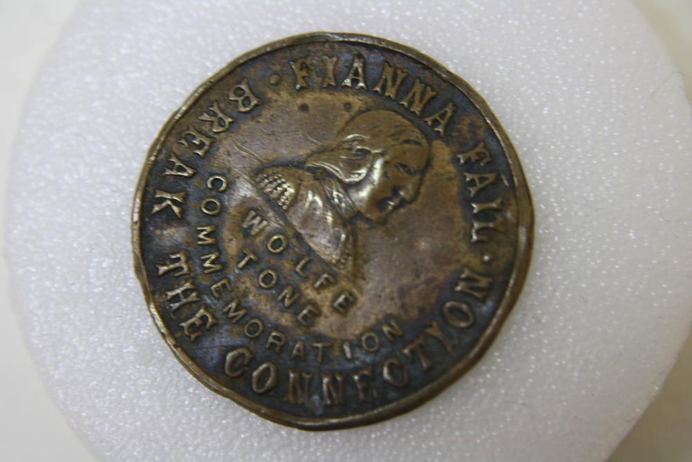 Fianna Fail medal c.1948. Brass disc, Wolfe Tone Commemoration badge. Obverse - Bust of Wolfe Tone and around FIANNA FAIL/ BREAK THE CONNECTION. Reverse stamped Quinn Dublin (maker). Pin missing.;