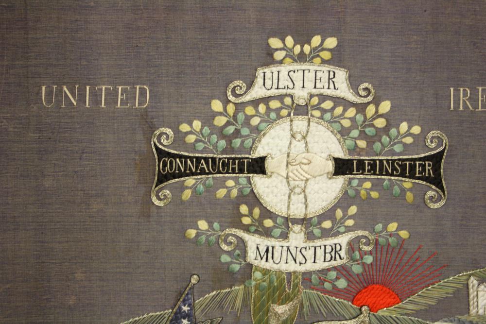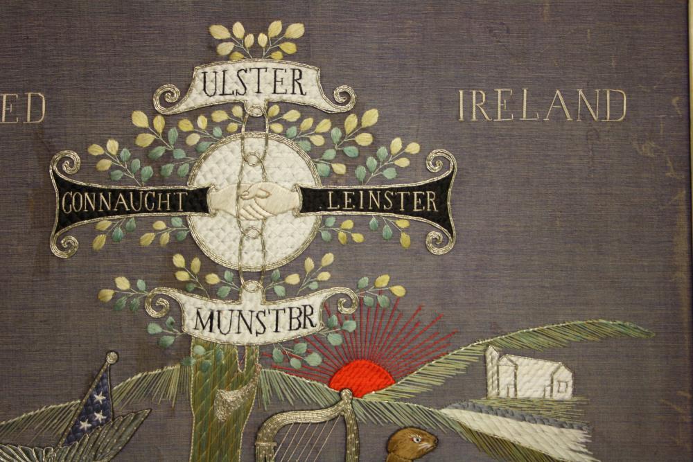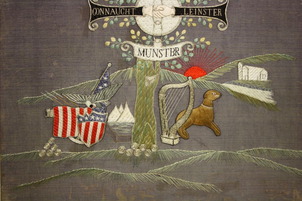 Embroidered panel. Irish-American depiction of Irish scenes - the Celtic cross and wolfhound, with the legend 'United Ireland' and the four provinces'. American flag and eagle to the side. Framed, not glazed.;