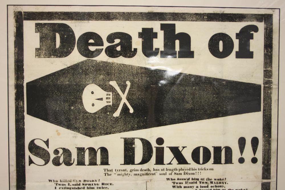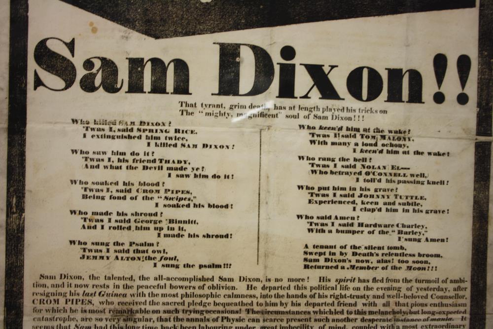 Election propaganda poster, Irish General Elections, 1832. Relating to the defeat of Samuel Dickson by the Whig party's Thomas Spring-Rice. "Death of Sam Dixon" printed within a broad mourning border, with a woodcut of a coffin, a skull and cross-bones and printed text.;