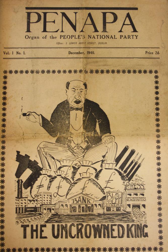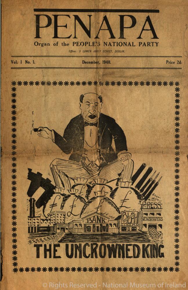 Newspaper ‘Penapa’ Organ of the People’s National Party. Vol.1, No.1., December 1940. Price 2d. Offices at 3 Lower Abbey Street, Dublin. Front cover with an illustration depicting a man sitting atop a bank surrounded by bags of money, and a queue of people entering the Unemployment Exchange building, with the words ‘The Uncrowned King’ underneath.;